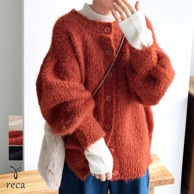 レディース トップス 前開き ボタン カーディガン ニット ニットカーディガン ニットカーデ 羽織 シャギーニット 起毛ニット カーデ アウター ライトアウター 起毛 長袖 トレンド シンプル カジュアル 大人女子 30代ファッション 30代コーデ レッド 赤 エクリュ ネイビー 紺色