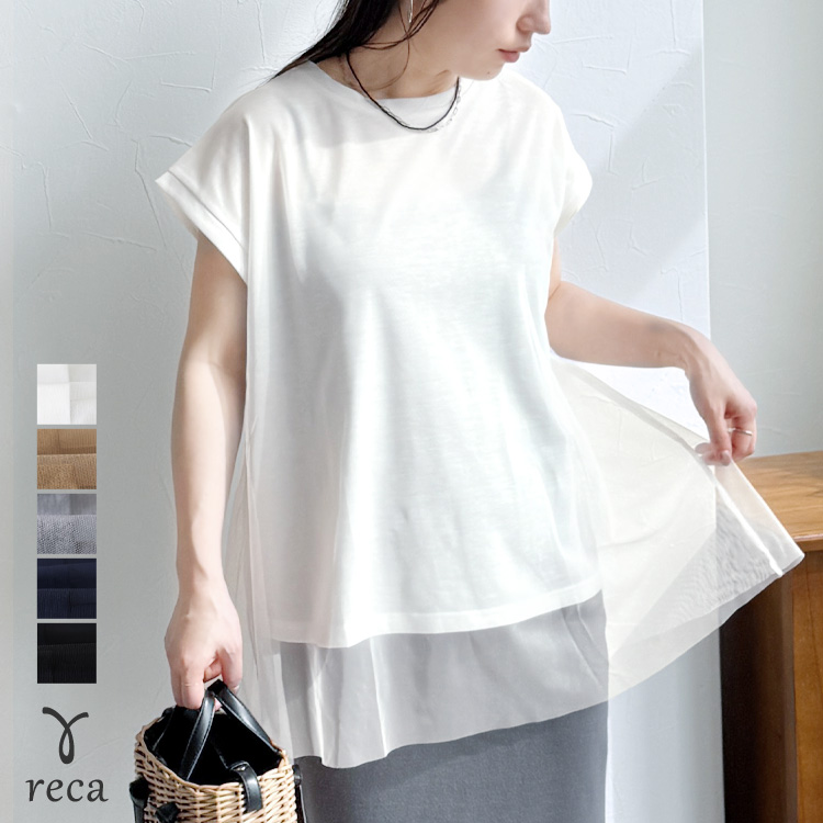 レディース トップス カットソー Tシャツ チュール 透け感 パワーネット ドッキング カジュアル シンプル レイヤード クルーネック 上品 キレイめ 楽ちん 半袖 夏 トレンド 大人女子 30代ファッション 30代コーデ オフホワイト 白 ブラック 黒 ネイビー ベージュ グレー