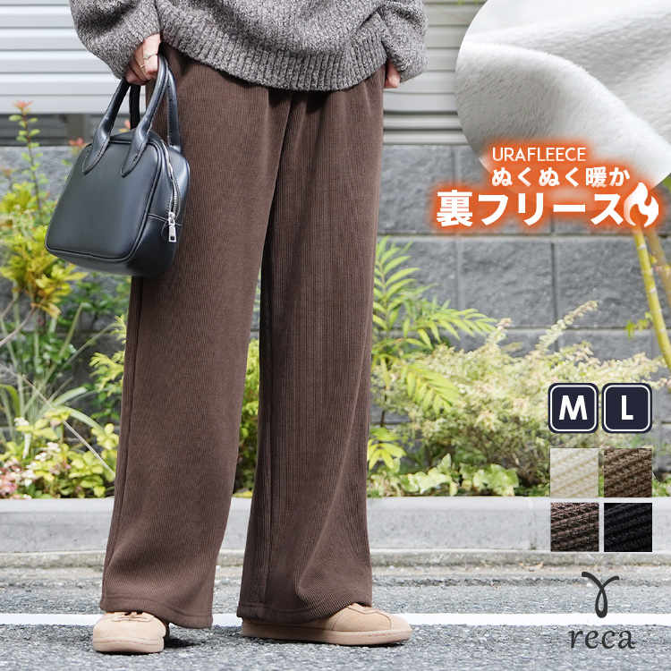 レディース ボトムス パンツ イージーパンツ ワイドパンツ 裏フリース 裏起毛 ウエストゴム ポケット ボンディング カジュアル シンプル 楽ちん コーデュロイ 暖かい あったか あたたかい 防寒 秋 冬 大人女子 30代ファッション 30代コーデ アイボリー モカ ブラウン ブラック 黒