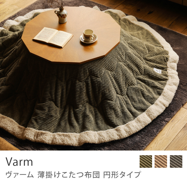 そんな秋冬ファッションに欠かせないコーデュロイ生地を用いて作られたのが、こちらのリセノ別注プロダクト「薄掛けこたつ布団 Varm(ヴァーム) 円形タイプ」。