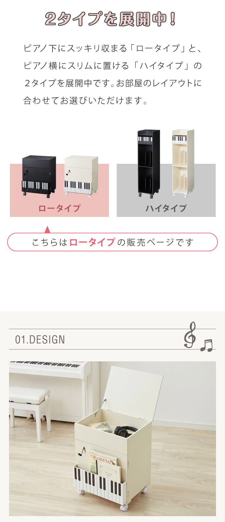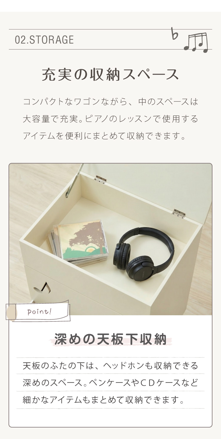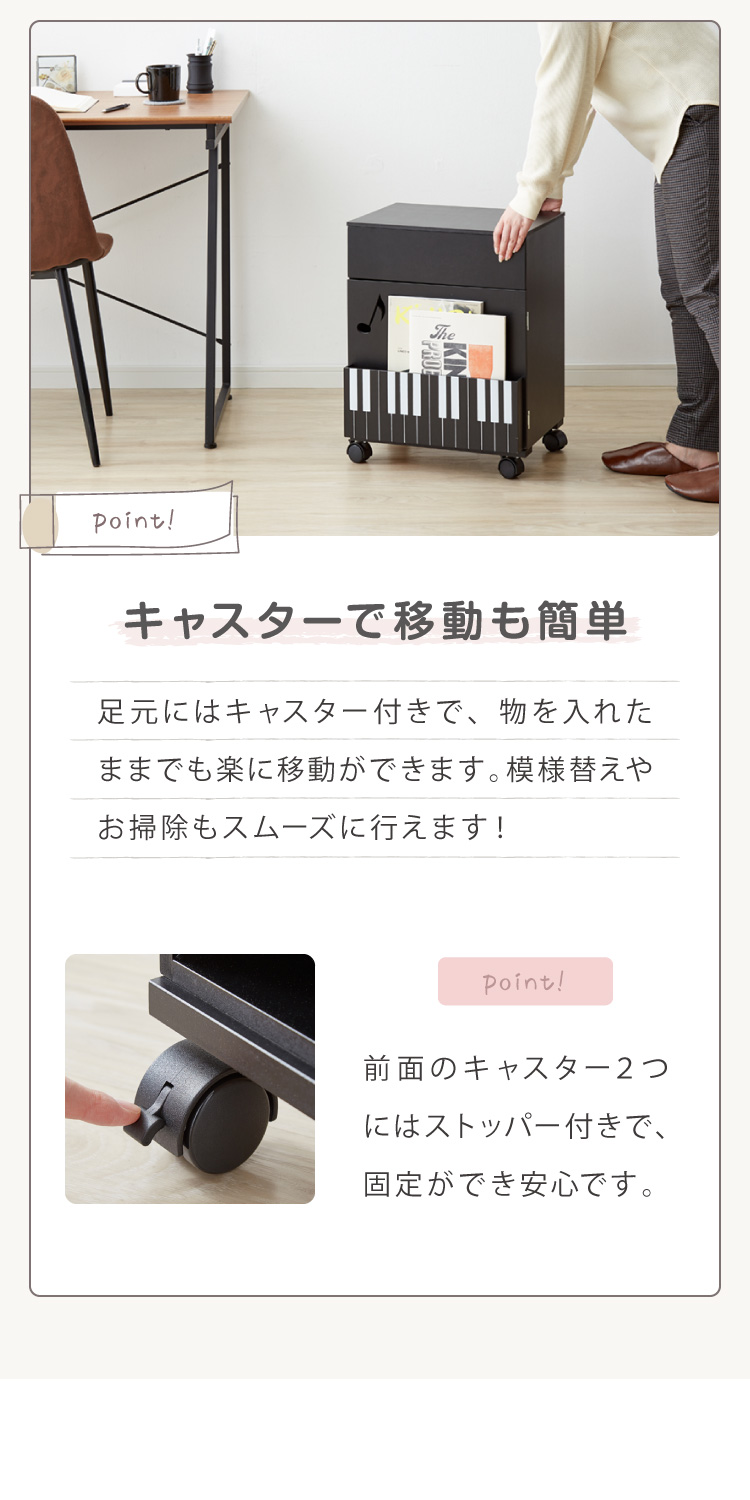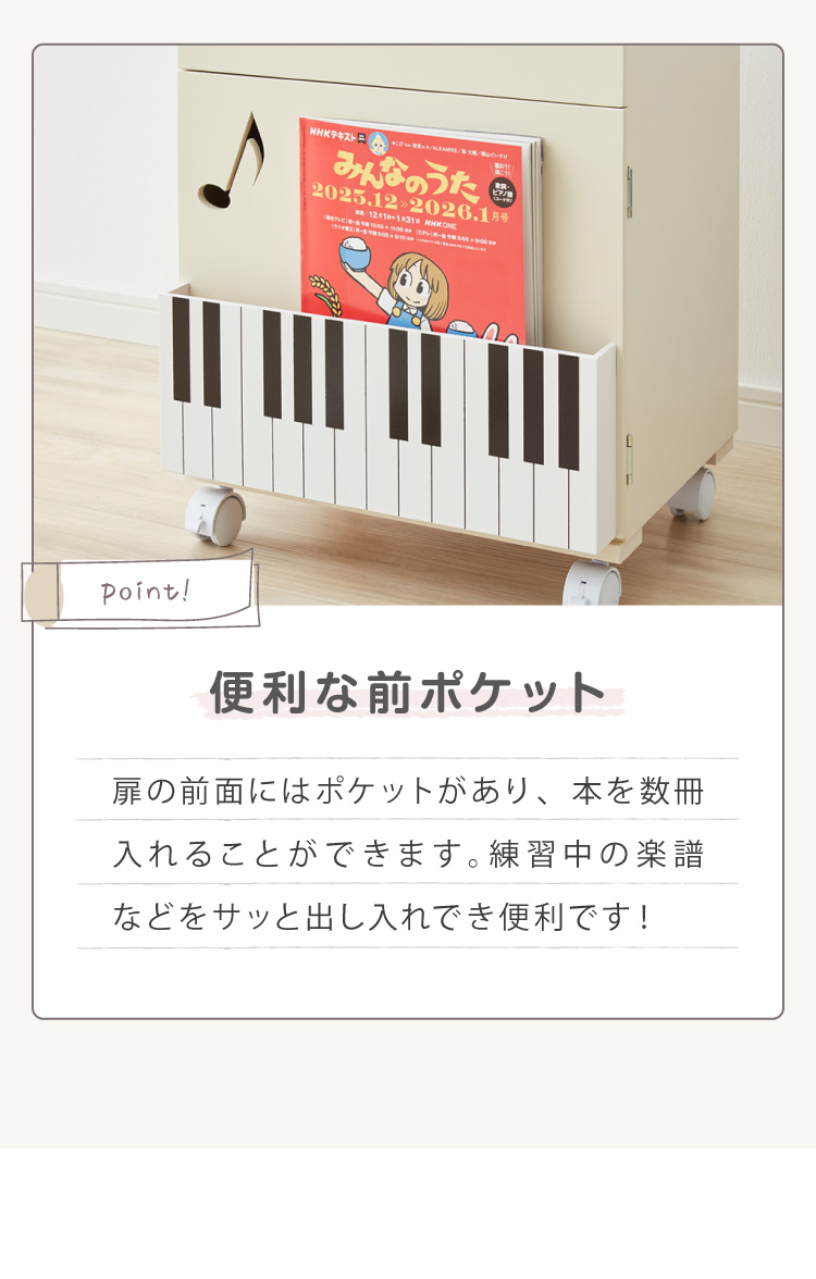ピアノまわりをすっきり、楽しく整える音楽モチーフの収納ワゴン。