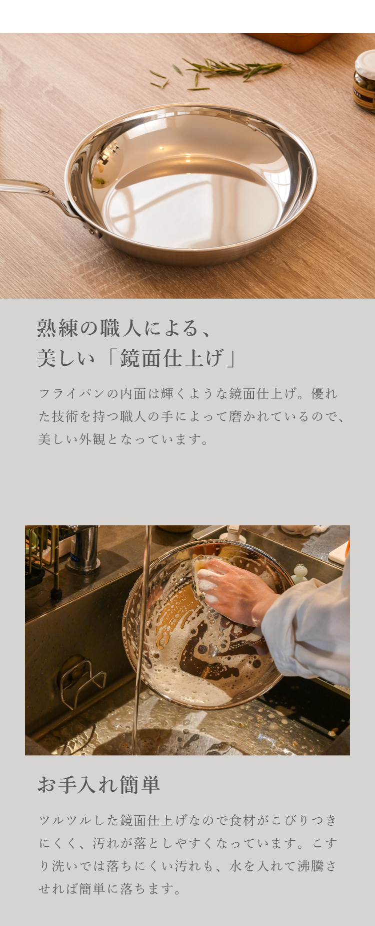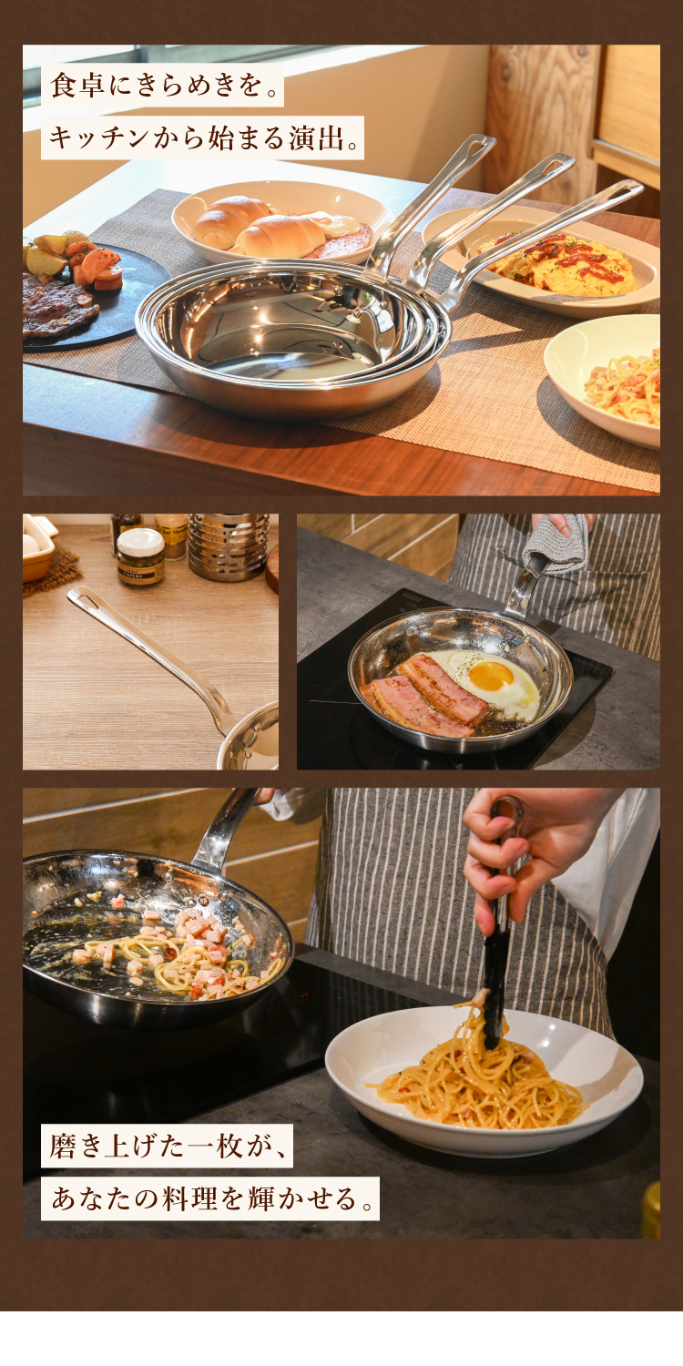 フジノス、FUJINOS、日本製、燕三条、フライパン、ステンレス、フッ素不使用、フッ素、使わない、PFASフリー、安全、プロ仕様、鏡面仕上げ、こだわりの道具、軽量、軽い