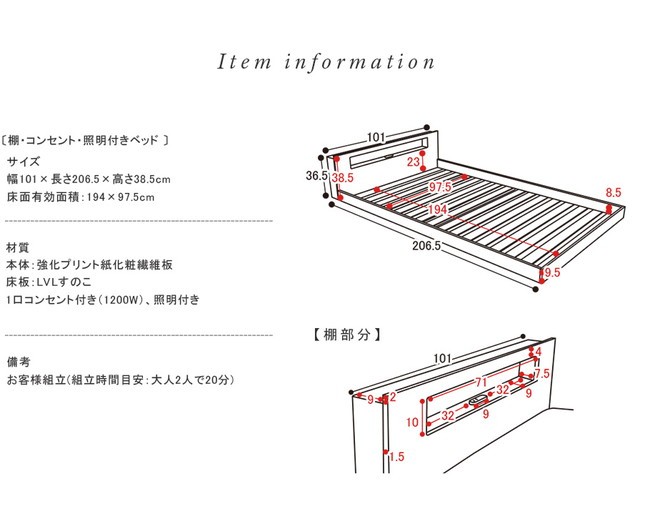 【棚・コンセント・照明付きフロアベッド クタナ】