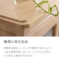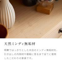・引き出しの内側材や、商品背面、棚付き商品は棚板等、通常だと合板を使用するような部分も全てミンディ無垢材を使用しています。