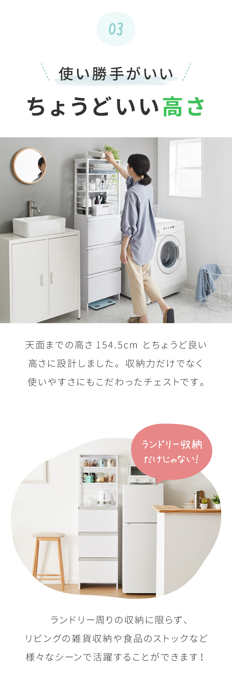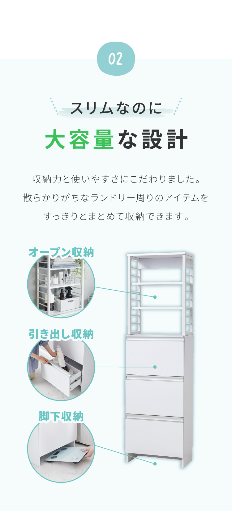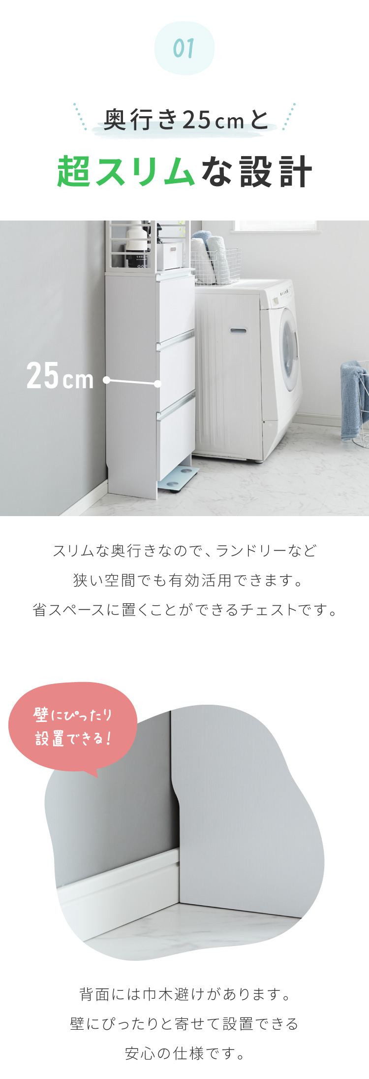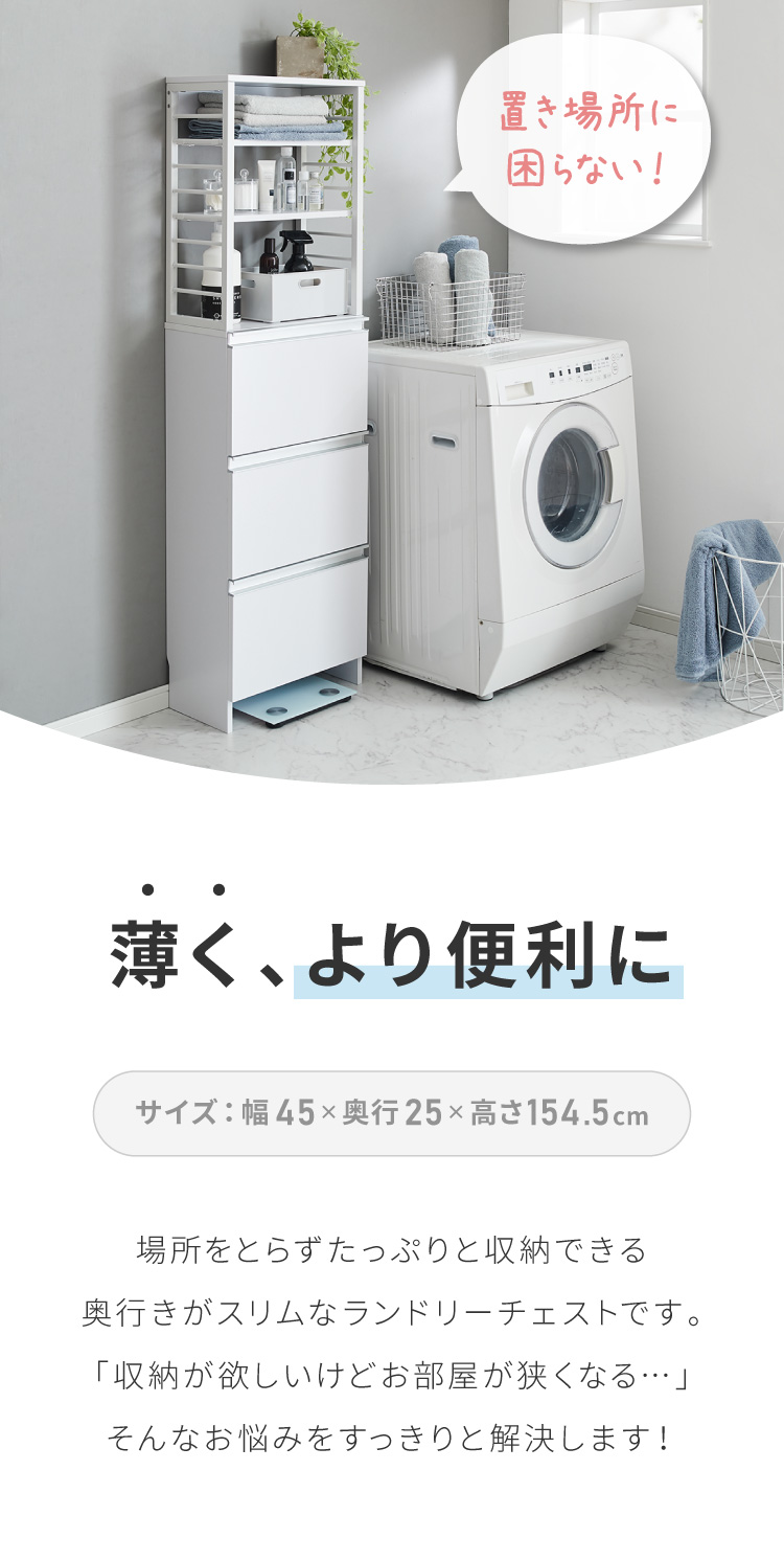 省スペースでもたっぷり収納できる奥行25cmのスリムなランドリーチェスト。高さ154.5cmで女性にも使いやすく、引き出しは全てフルスライドレール仕様でスムーズ開閉。上部の棚は8段階で高さ調整が可能。コンセントやスイッチの妨げにならないオープン設計で実用性抜群。巾木よけやヘルスメーター収納スペース、転倒防止金具も備え、安全性と収納力を両立した一台です。