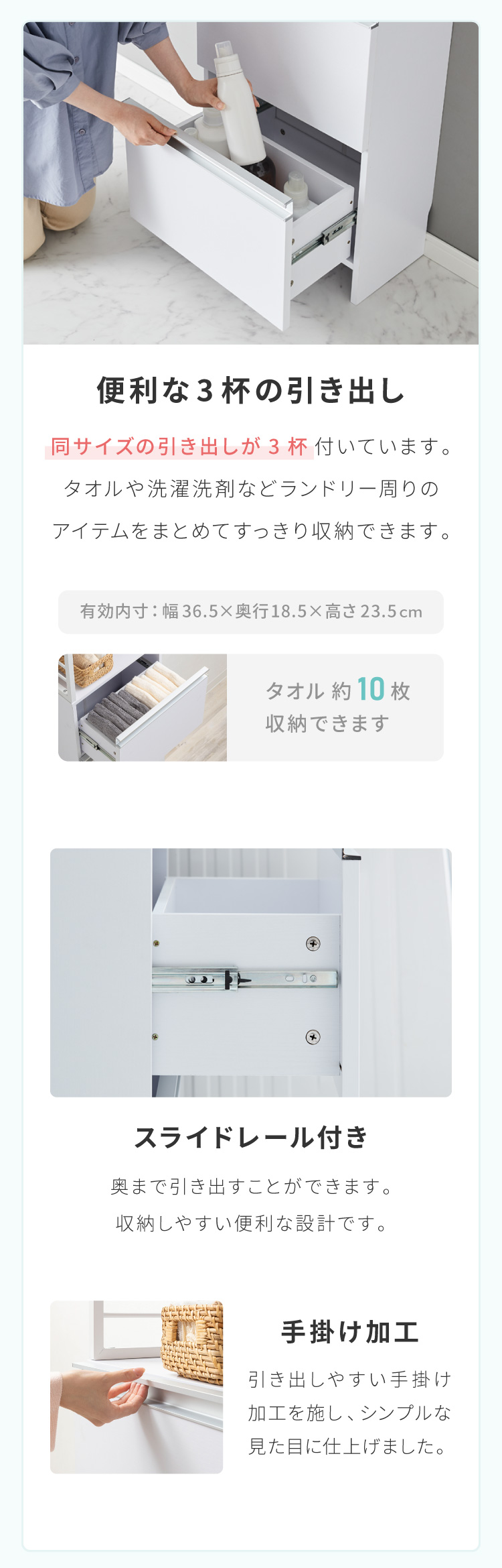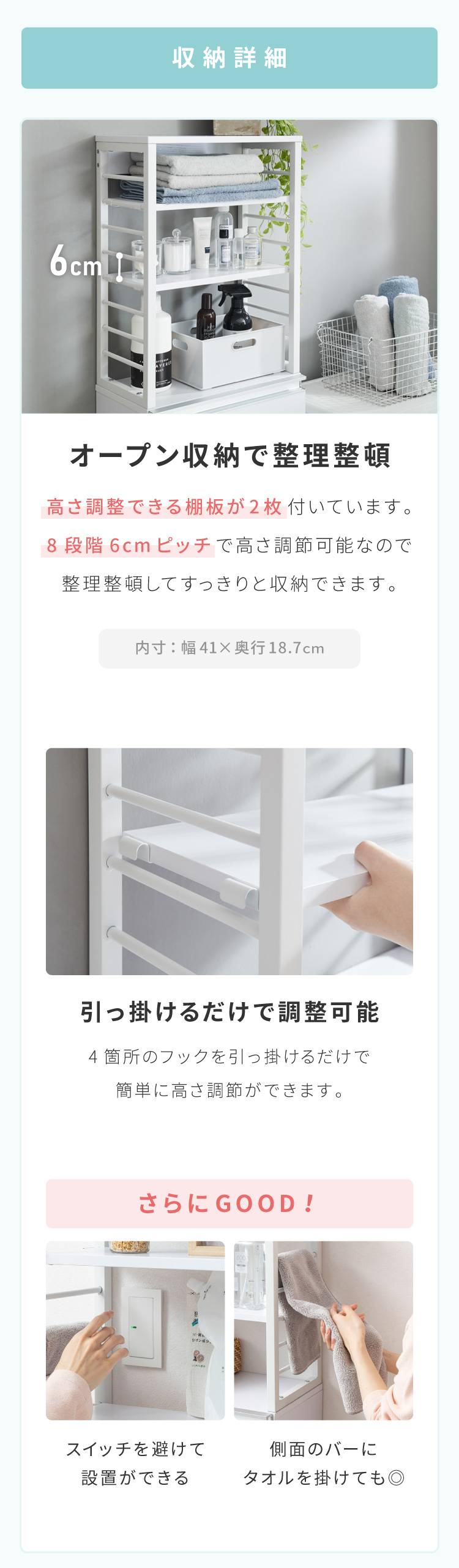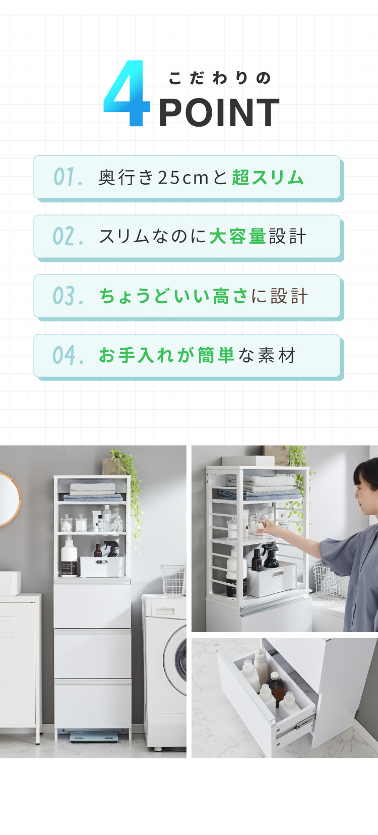 省スペースでもたっぷり収納できる奥行25cmのスリムなランドリーチェスト。高さ154.5cmで女性にも使いやすく、引き出しは全てフルスライドレール仕様でスムーズ開閉。上部の棚は8段階で高さ調整が可能。コンセントやスイッチの妨げにならないオープン設計で実用性抜群。巾木よけやヘルスメーター収納スペース、転倒防止金具も備え、安全性と収納力を両立した一台です。
