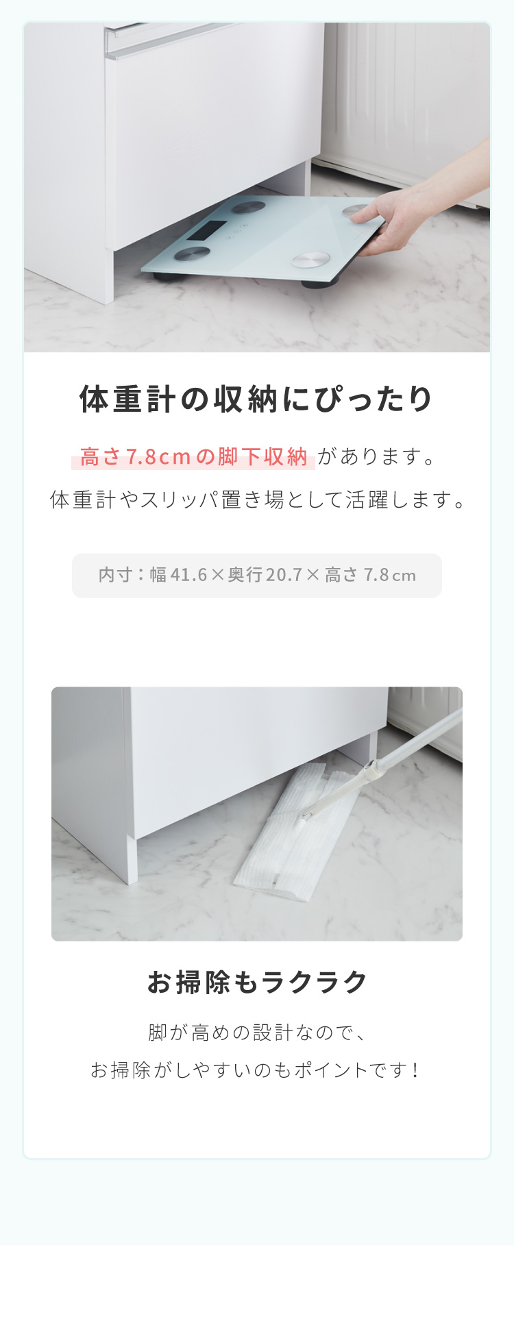 特徴 可動棚8段階調整/フルスライド引き出し×3段/巾木よけ・転倒防止金具・背面補強付き/ヘルスメーター収納スペースあり