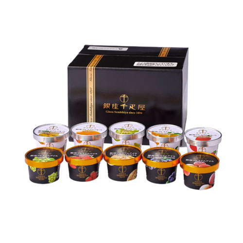 プレミアムアイス(カスタードバニラ、とちおとめ、マスカット、ピーチ、ブルーベリーチーズ)、プレミアムソルベ(マンゴー、柚子はちみつ、メロン、ストロベリー、ゴールデンパイン)各90ml×各1個 計10個