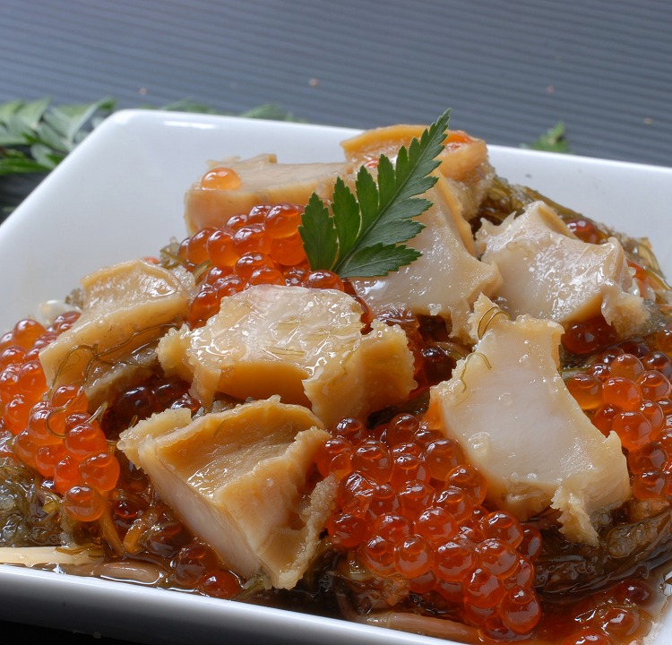まろやかでコクのある調味液に北海道産の昆布、スルメ、そして歯触りの良い数の子を加えて漬け込み、丹念に熟成させた松前漬にあわび、いくらを添えたあわび松前漬です。白飯にかけるのはもちろん、酒の肴としてもお召し上がり頂けます。