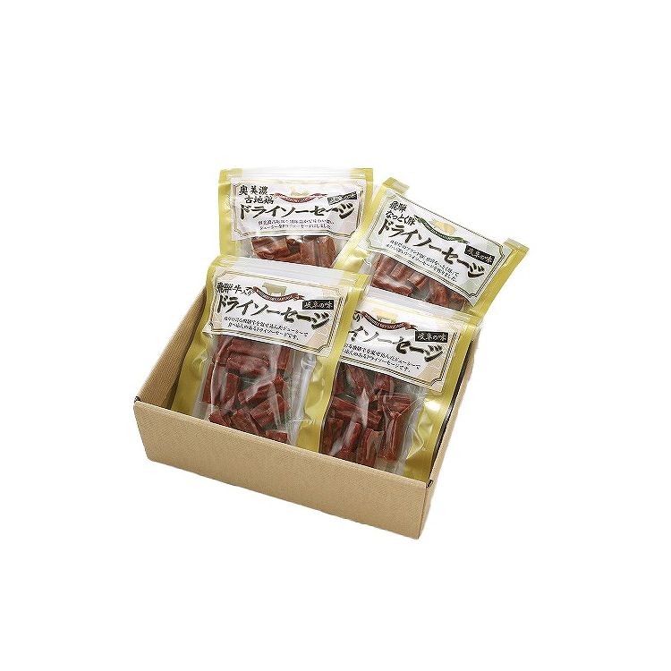 飛騨牛入りドライソーセージ40g×2、飛騨なっとく豚ドライソーセージ50g×1、奥美濃古地鶏ドライソーセージ50g×1