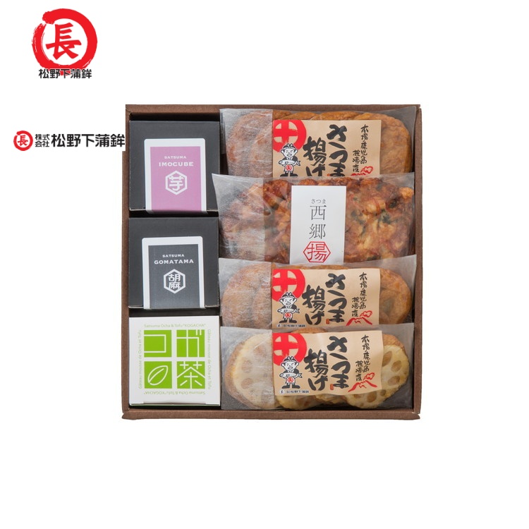 第70回の全国蒲鉾品評会にて水産庁長官賞を受賞した「芋キューブ」、特別賞の「コガ茶」、鹿児島県さつま揚げ青年部で共同開発した「西郷揚げ」などを詰合せました。