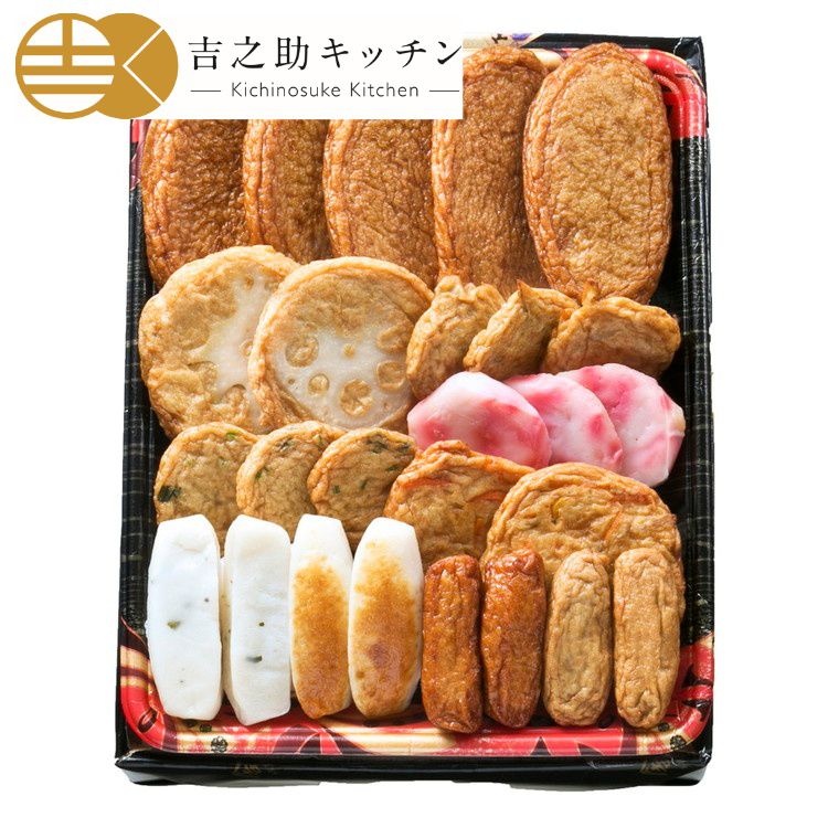 内容量:にら天×3、紅しょうが天×3、ごぼう天×3、特上揚×5、あおさちぎり蒲鉾×2、野菜天×2、上棒天×2、ちぎり蒲鉾×2、れんこん天×2、いわし棒天×2