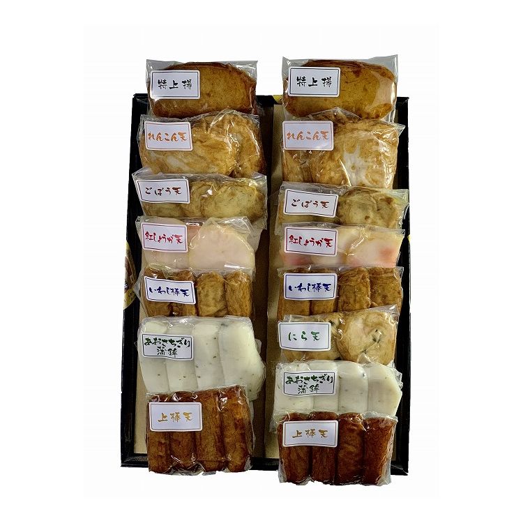 内容量:にら天3個×1、紅しょうが3個×2、ごぼう天3個×2、特上揚2個×2、あおさちぎり蒲鉾4個×2、上棒天4個×2、れんこん天2個×2、いわし棒天4個×2 (全て真空包装)