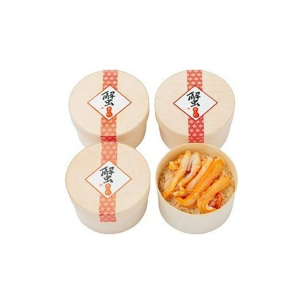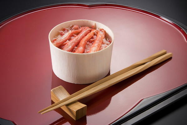 日本海で獲れた鮮度抜群な「ベニズワイガニ」をふんだんに使用しています。カニの旨味をたっぷり入れた当社特製の白だしで炊き上げたおこわに丁寧にほぐしたカニ身をふんだんにふりかけ、更に贅沢にカニのむき身をトッピングしました。