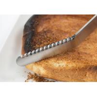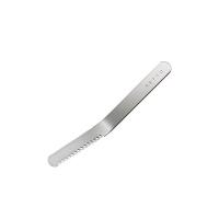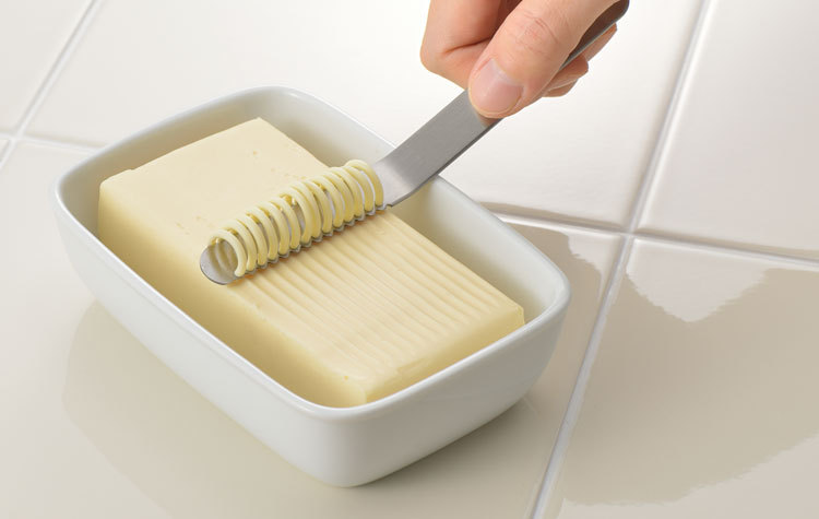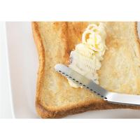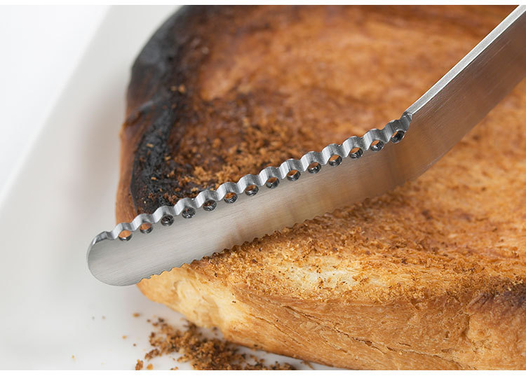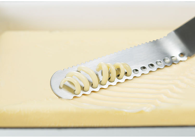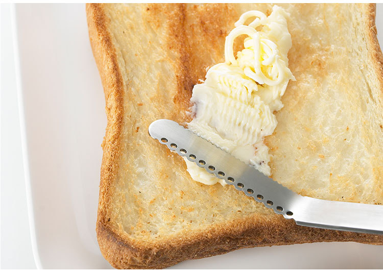 斜めの小さな穴が固いバターを糸状に削り、そのまま塗れます。ギザ刃部分はコゲ落としとして使用できます。取っ手と刃部は一体成型なので丈夫です。