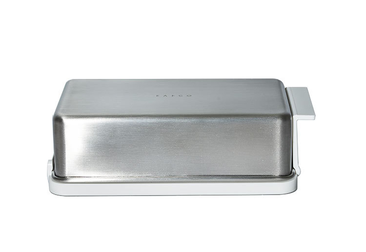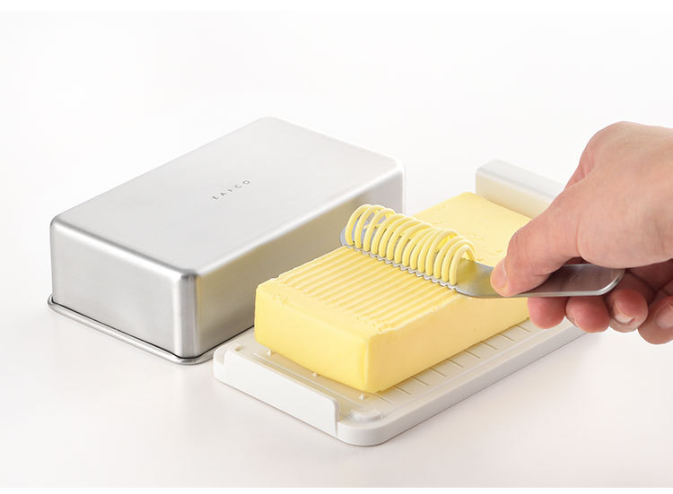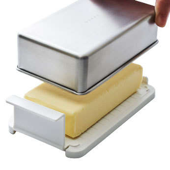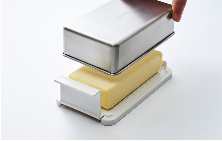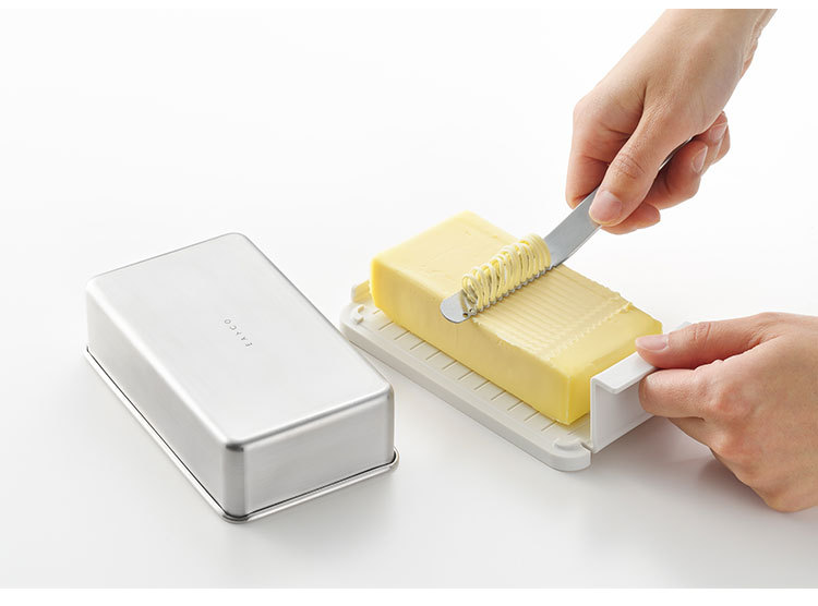 ステンレスと樹脂を組み合わせ、容器の密閉性を高めたバターケース。バターの乾燥を防ぎ、臭いもつきにくく快適に使えます。トレーには切り分けがしやすいライン入りです。