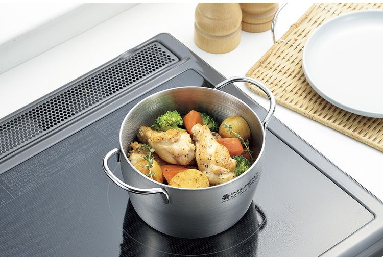 熱の伝わりの良いアルミ芯三層構造。焚火、炙り火にも使用でき、蓋はステンレス3mm厚と重いので、アウトドアの炊き込みや煮込み調理に最適です。