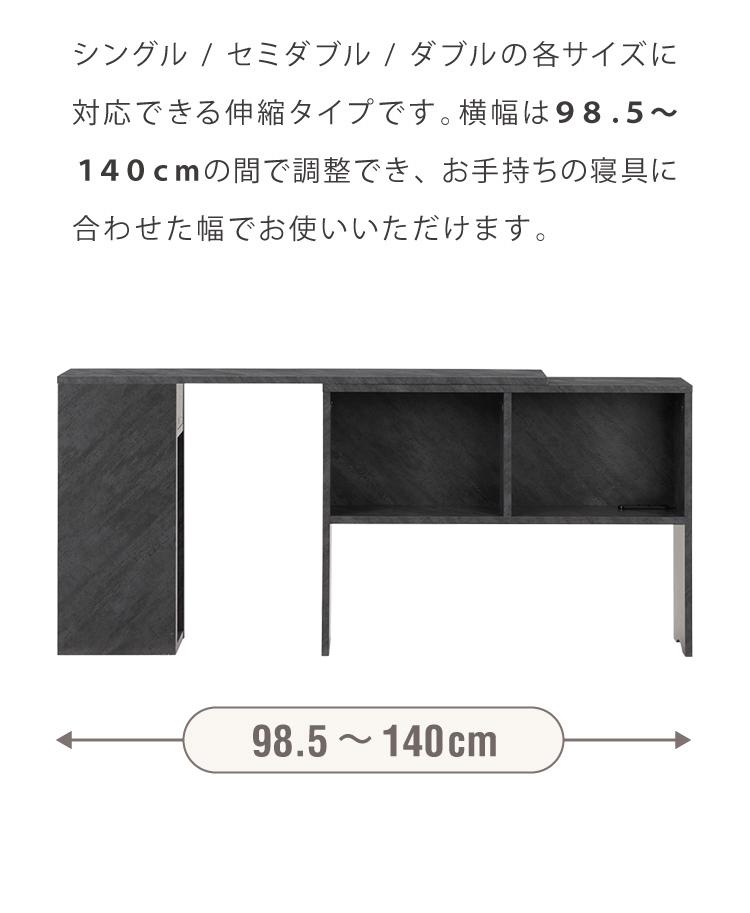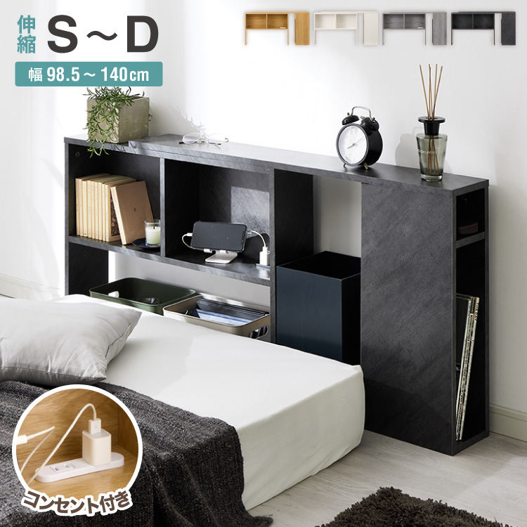 コンセント付き 伸縮式ヘッドボード 幅98.5~140cm シングルからダブルまで対応 奥行き15cm ヘッドボード ベッド収納 収納家具 本棚 ラック