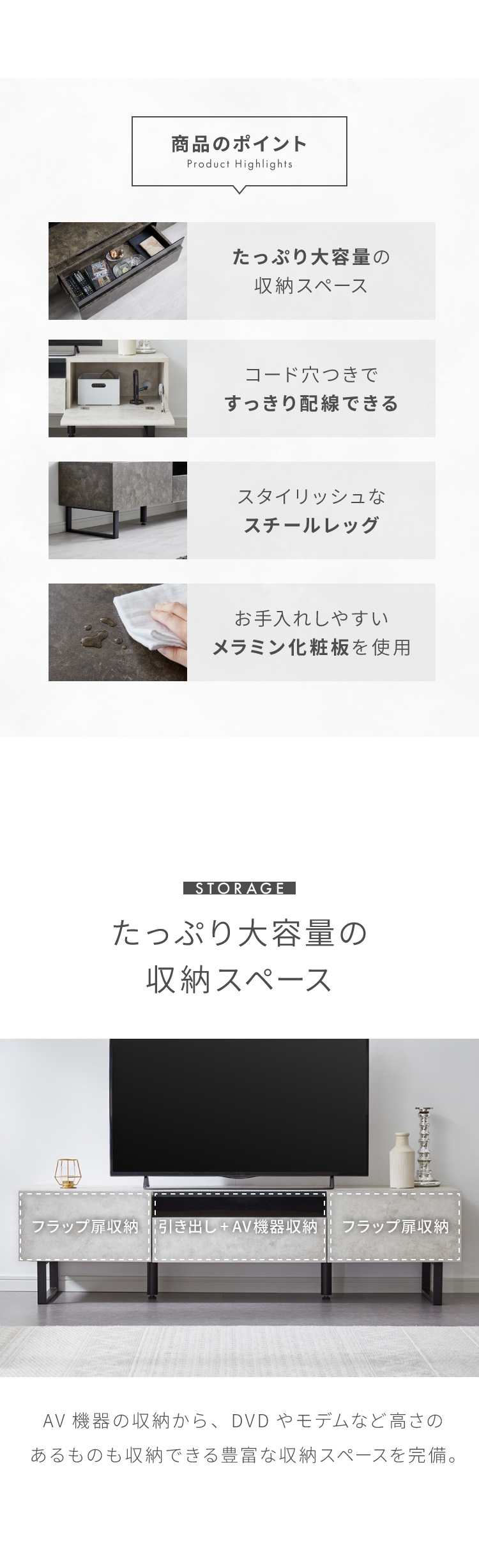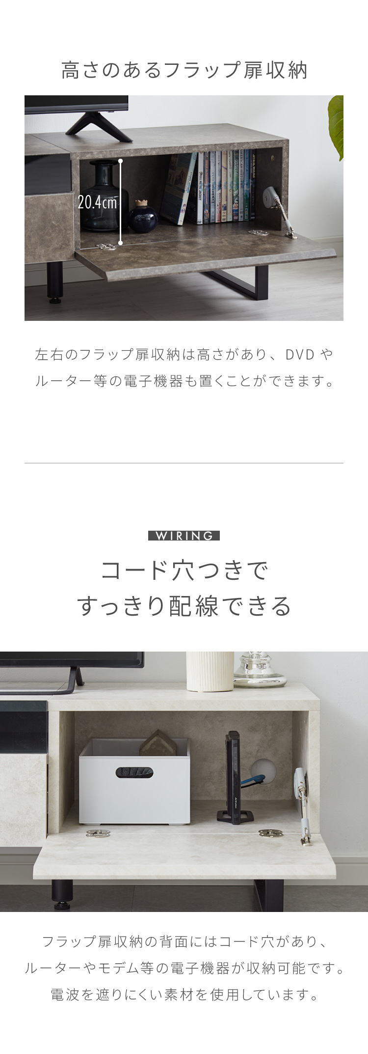・フラップ扉部分には両サイドにコード穴をつけたのでルーターなど電源が必要なものを収納可能