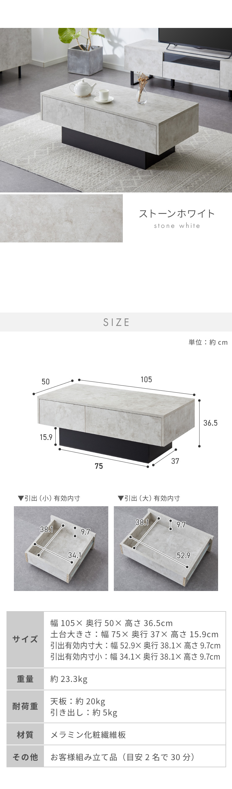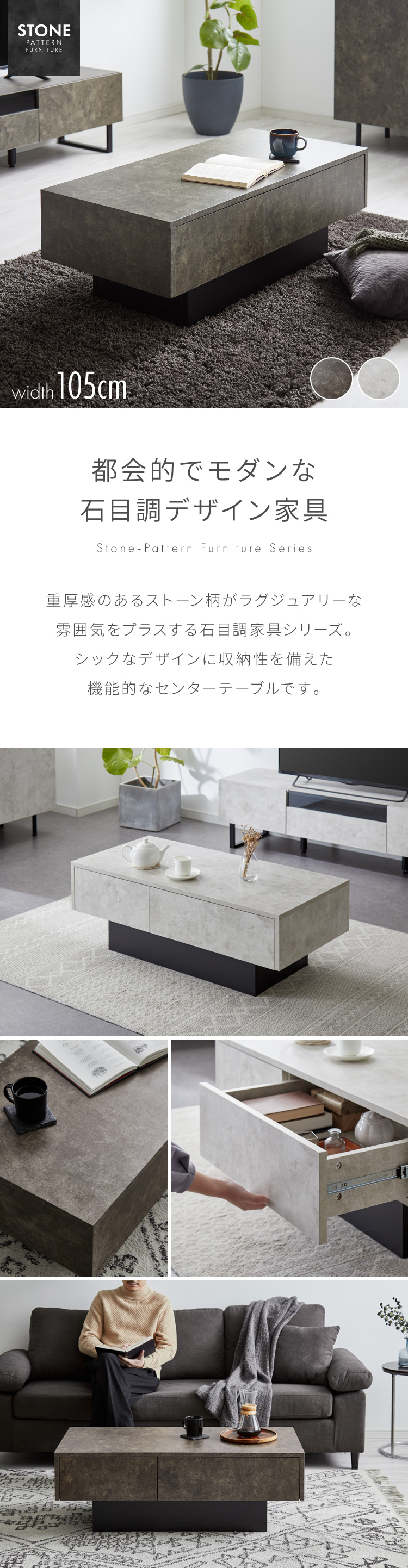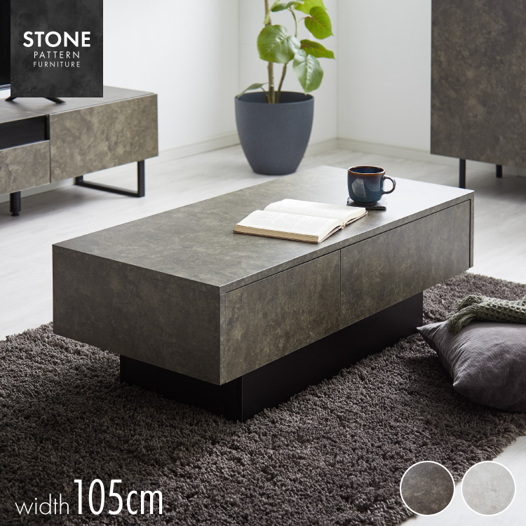 引き出し付き センターテーブル ストーン調 長方形センターテーブル 105×50 テーブル ローテーブル 幅100 セラミック調 グレー リビングテーブル