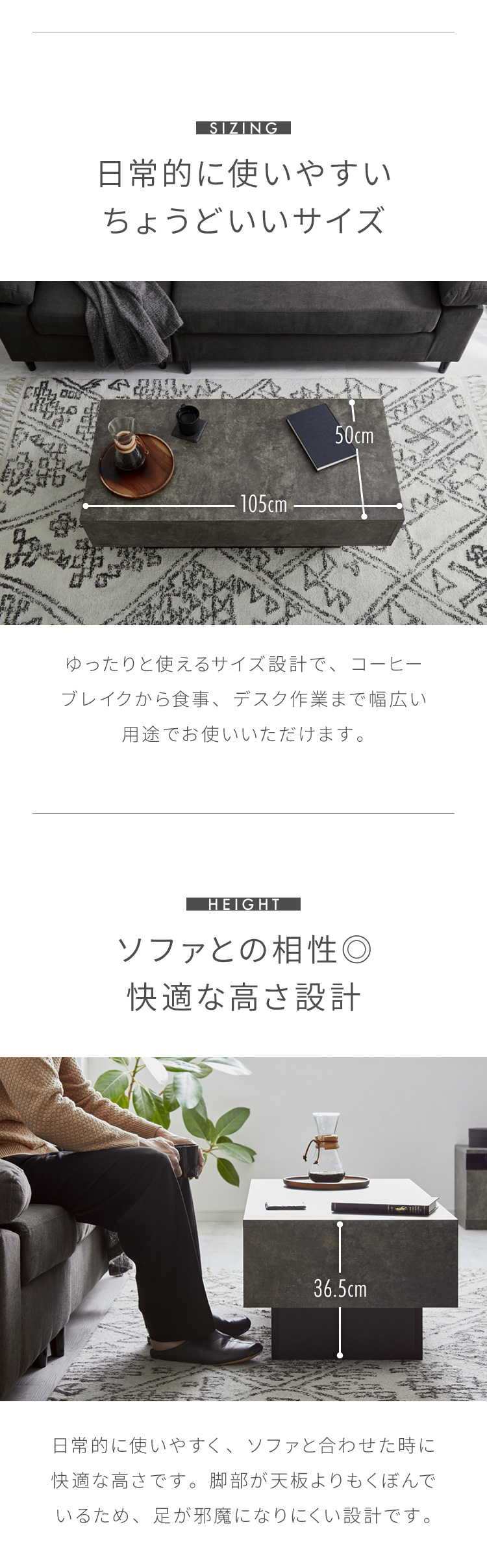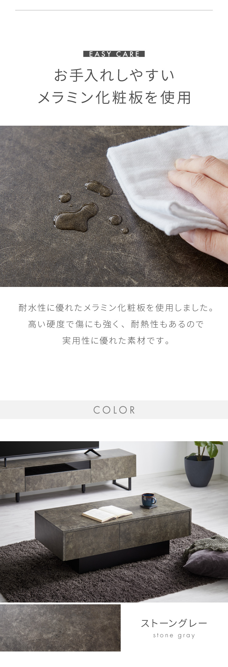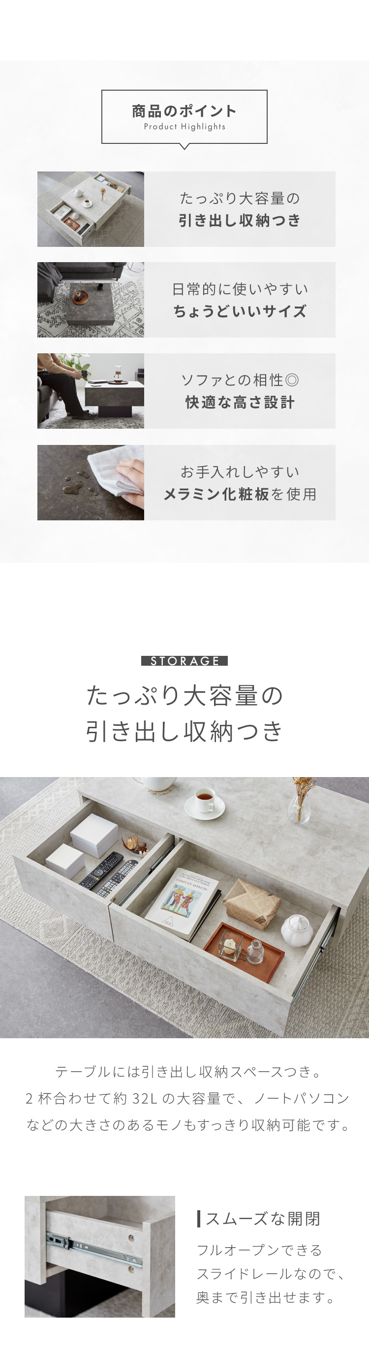引き出し付き センターテーブル ストーン調 長方形センターテーブル 105×50 テーブル ローテーブル 幅100 セラミック調 グレー リビングテーブル