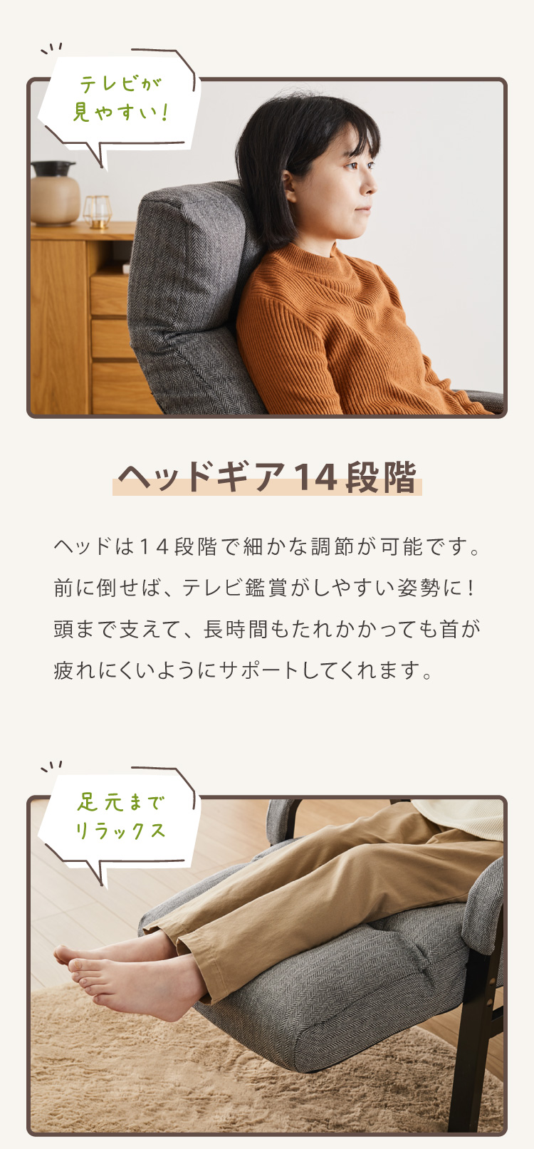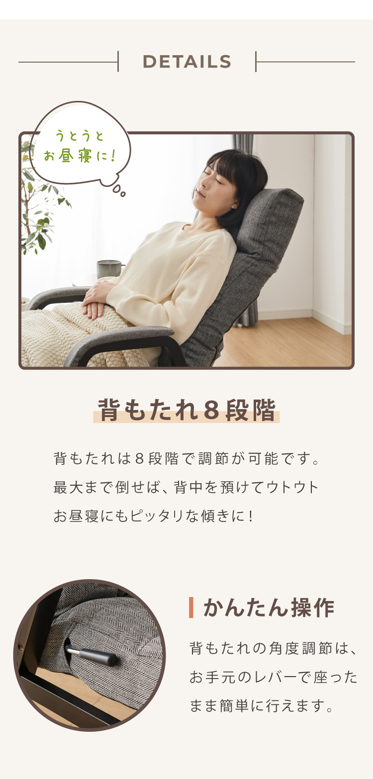 レバー式のリクライニング8段階で、シーンに合わせて角度を調節し、ゆったりと座ることができます。
