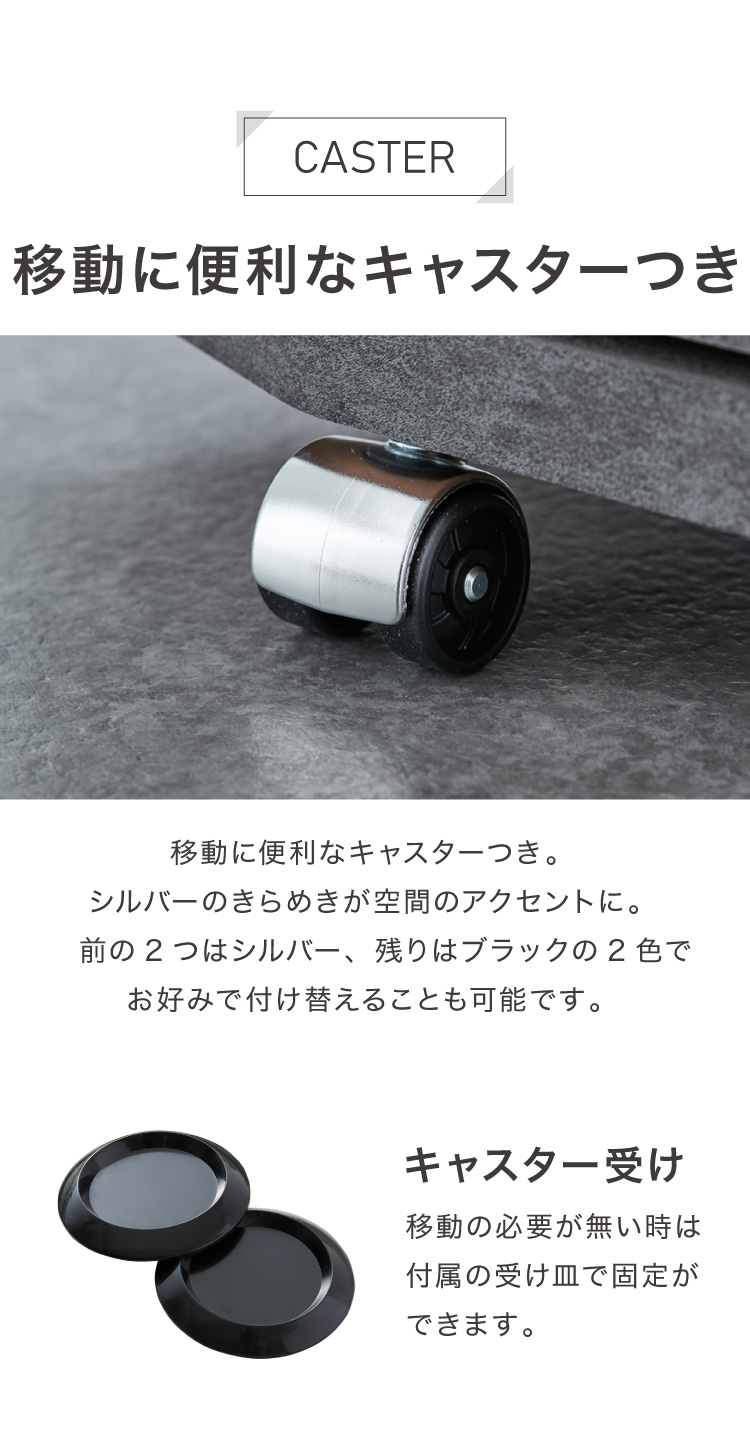 キャスターは空間のアクセントになるシルバー塗装と、主張を抑えたブラックの2種類から選べます。