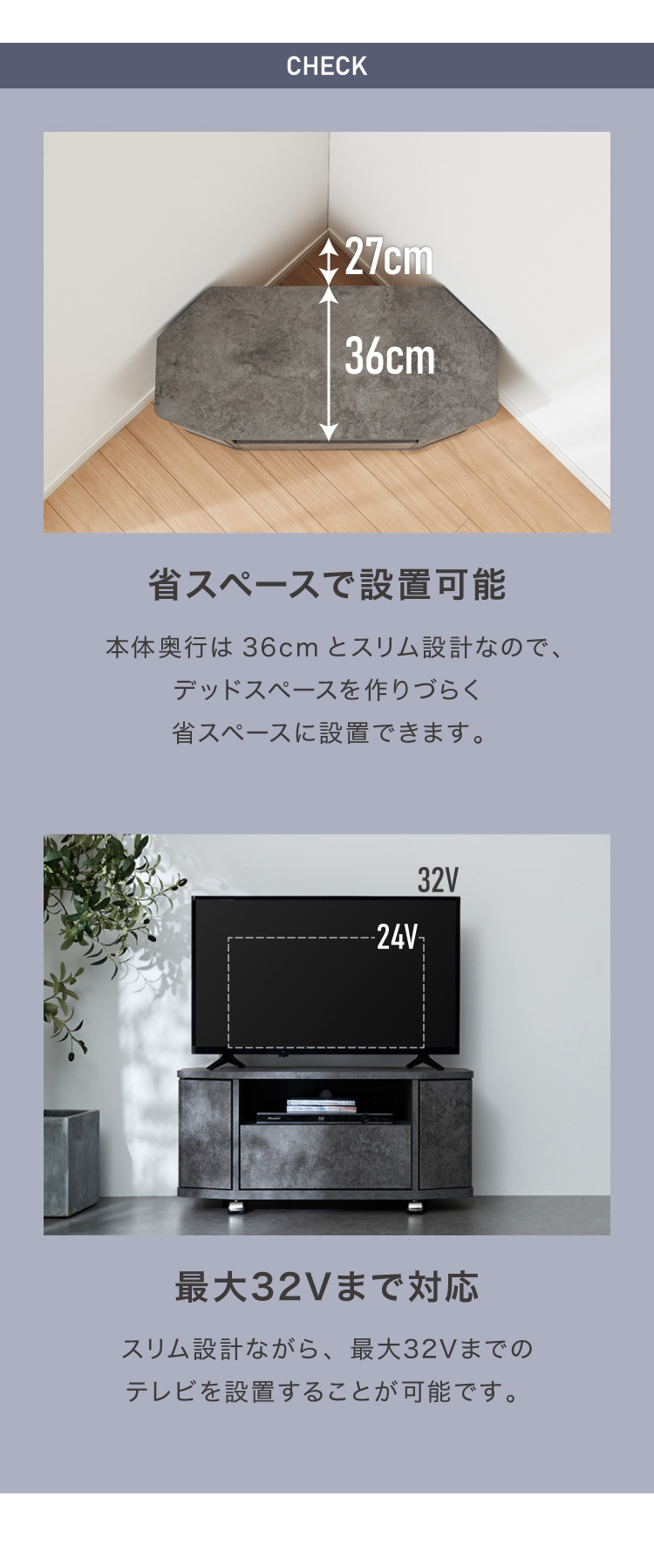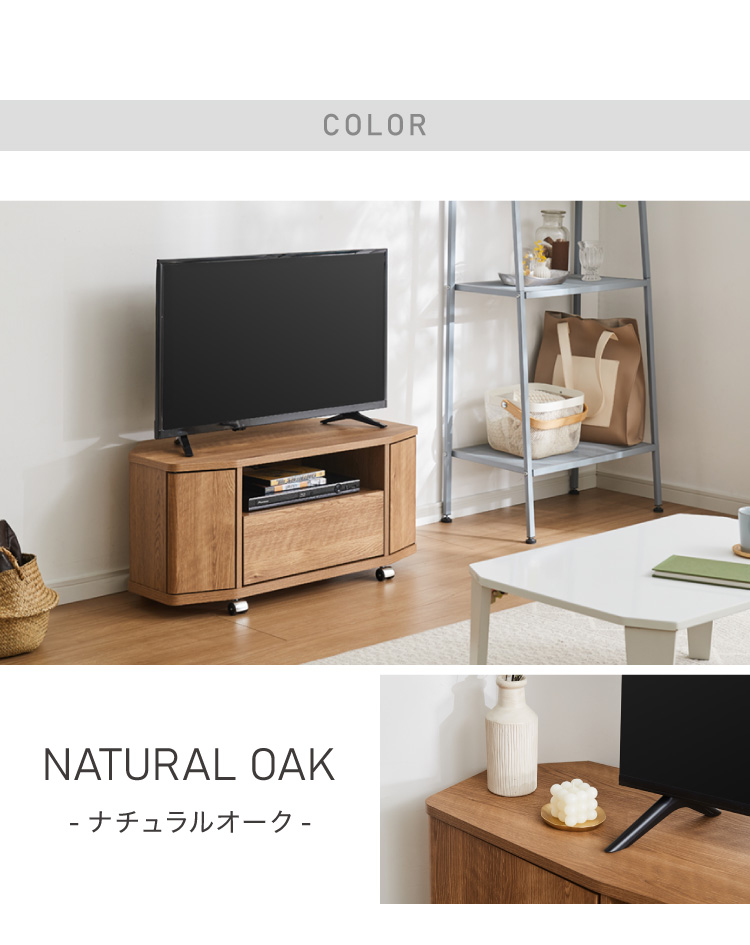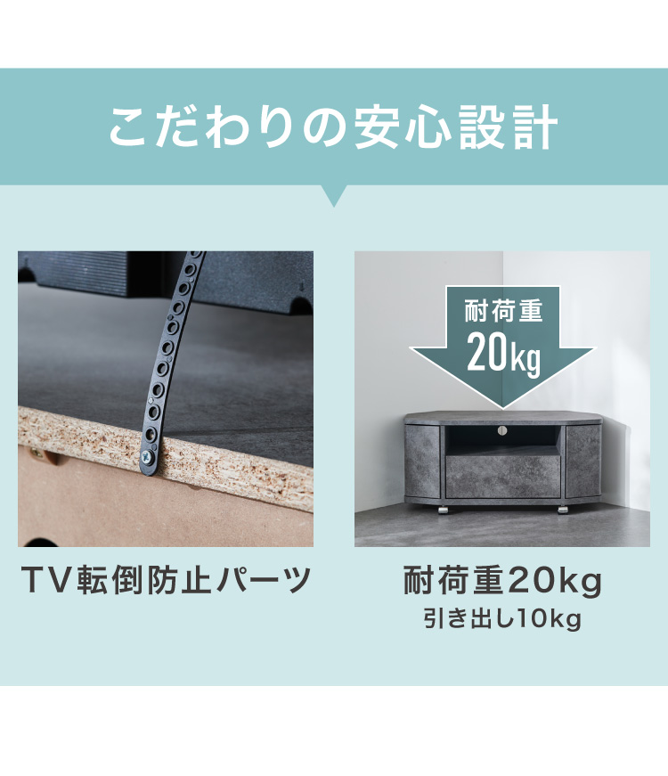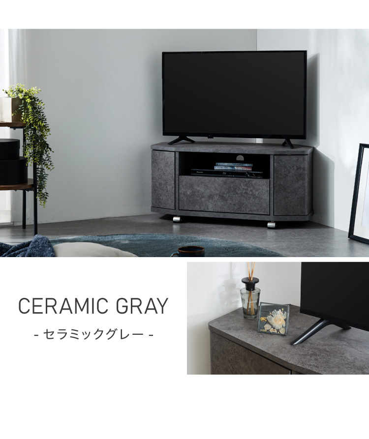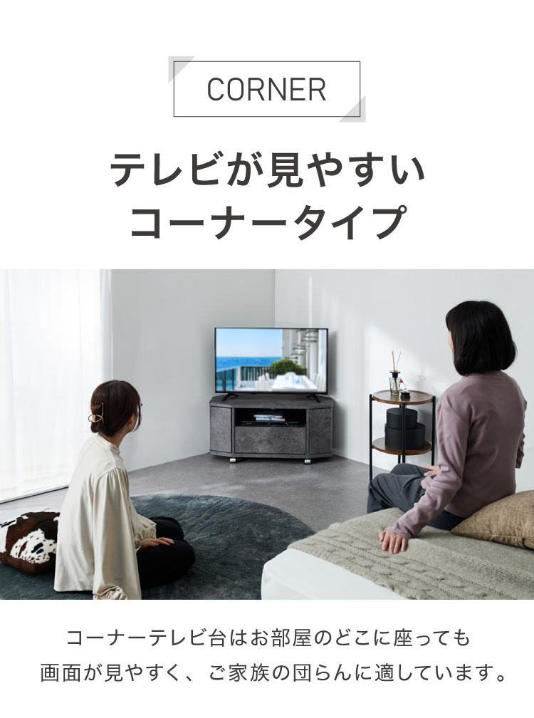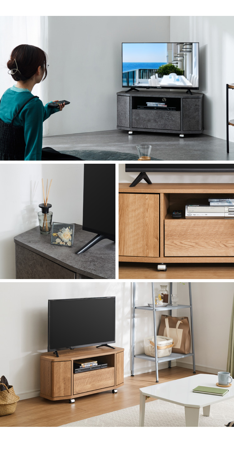 お部屋の角にすっきり収まる、省スペース設計のコーナーテレビ台。
