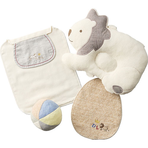 セット内容:授乳スタイ・汗とりパット・ボール・ピロー(ゴムバンド付)(約19×27×5.5cm)・竹籠(24.5×32×8cm)×各1