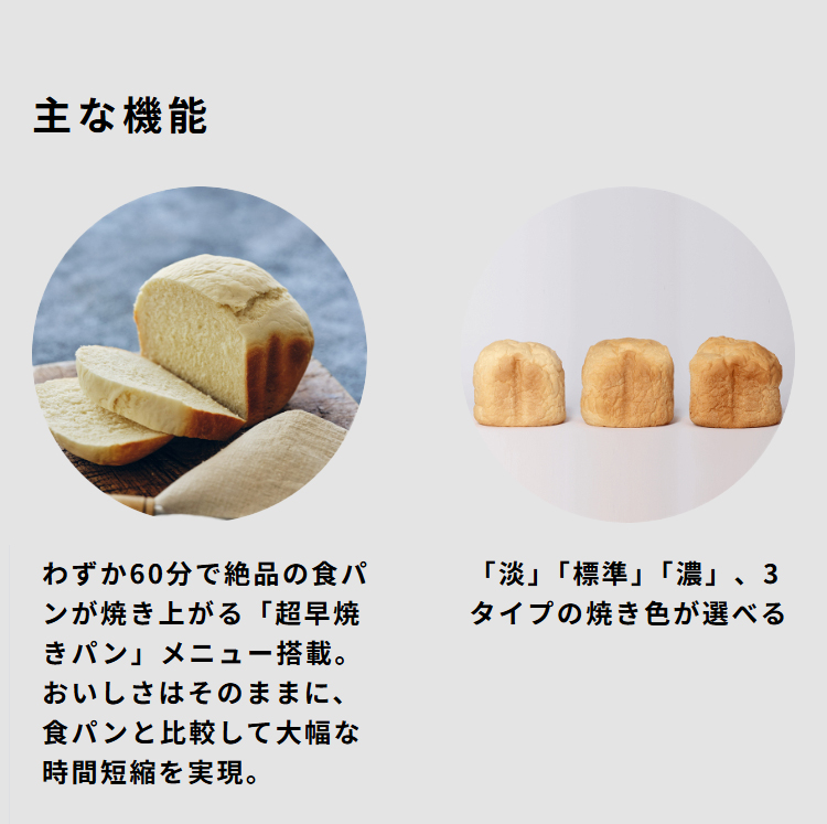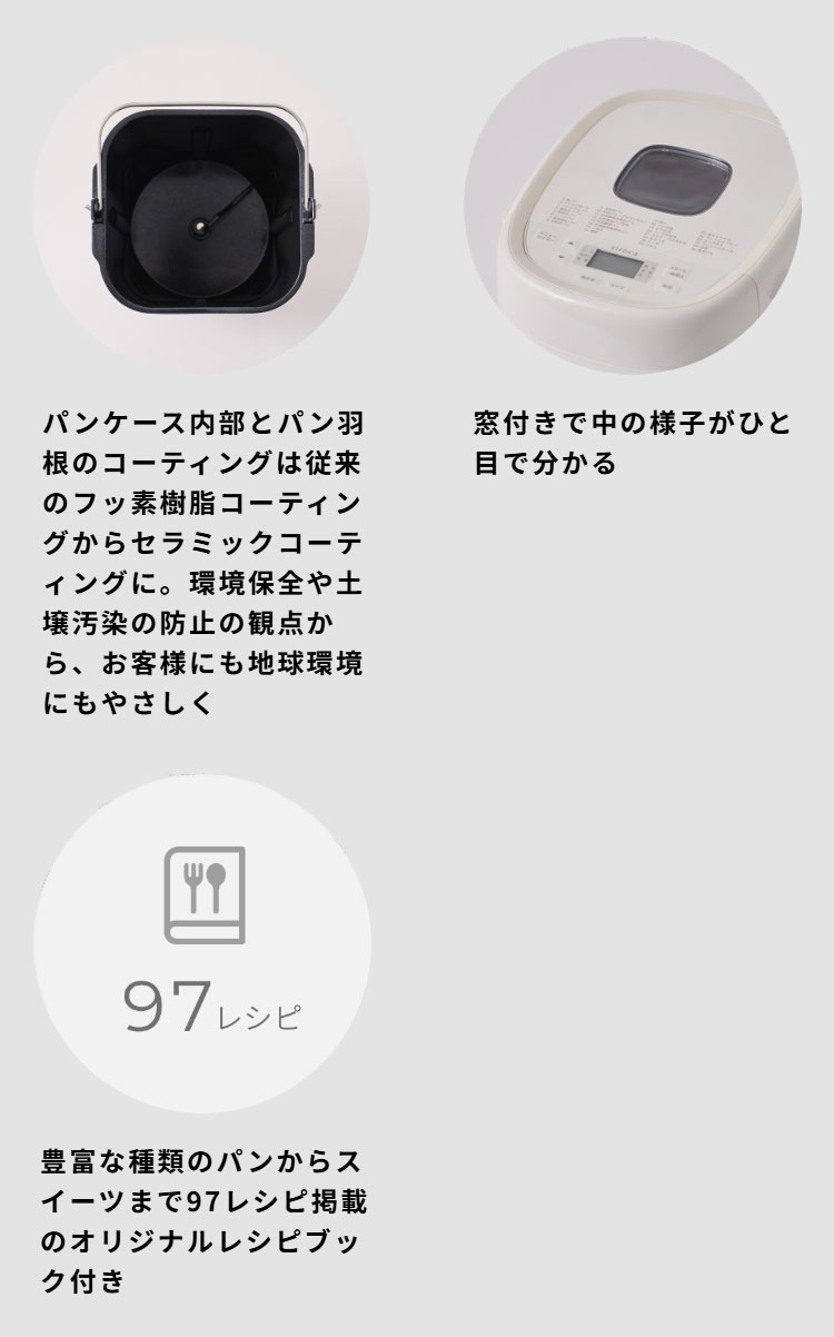 ・付属品:計量カップ、計量スプーン、パンケース、パン羽根、羽根取り棒、ヨーグルト専用容器、レシピブック