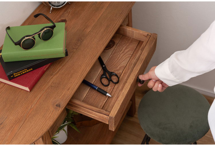 上部の引出しと下部の棚板により、収納力の高さも保たれています。