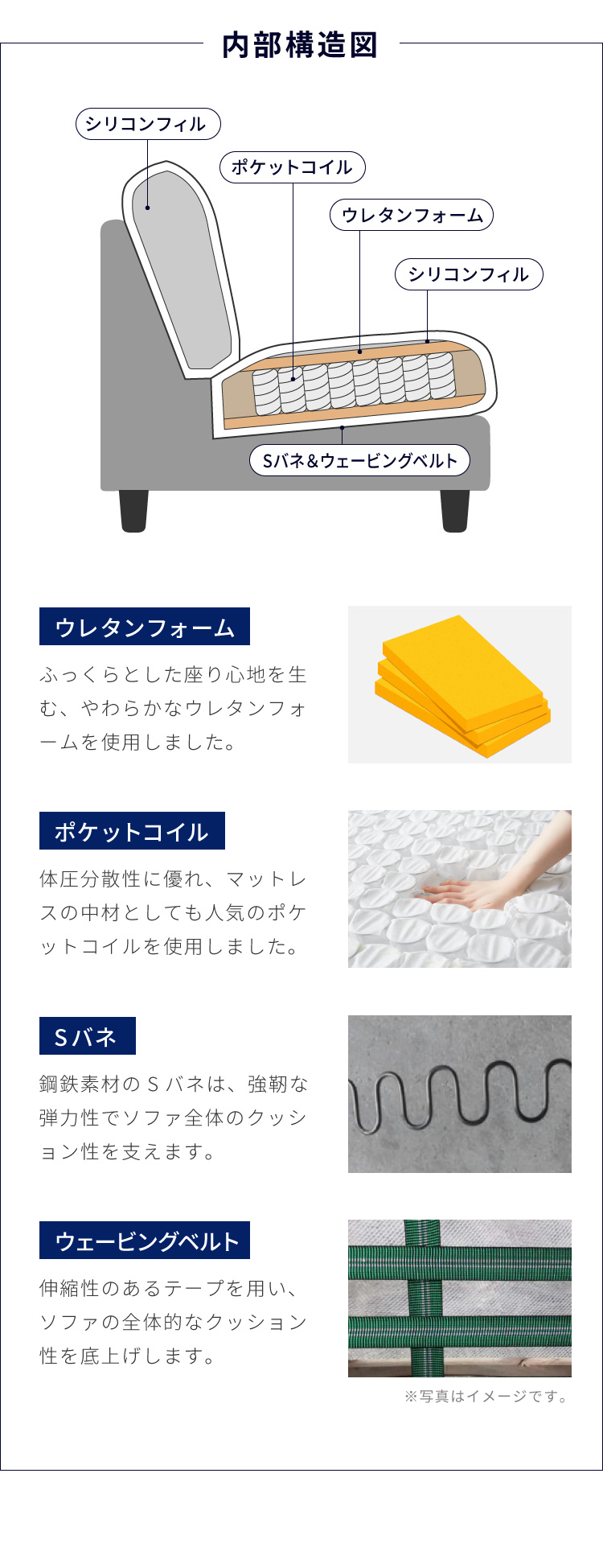 シリコンフィル/ウレタン/ポケットコイル/ウェビングベルト/Sバネ/天然木/合板