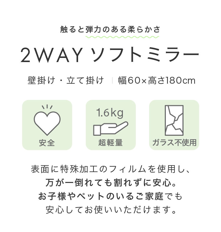 ソフトミラー、ソフト、幅60cm、高さ180cm、2wayソフトミラー、壁掛け鏡、ウォールミラー、立て掛け鏡、スタンドミラー、全身ミラー、薄型ミラー、薄型、フィルム製、フィルムミラー、ソフト、鏡、ミラー、メイク、ファッションチェック、運動、ヨガ、鮮明、高反射率、軽量設計、おしゃれ、かわいい、韓国インテリア、シルバー、ホワイト、ナチュラル、木目調、飛散防止
