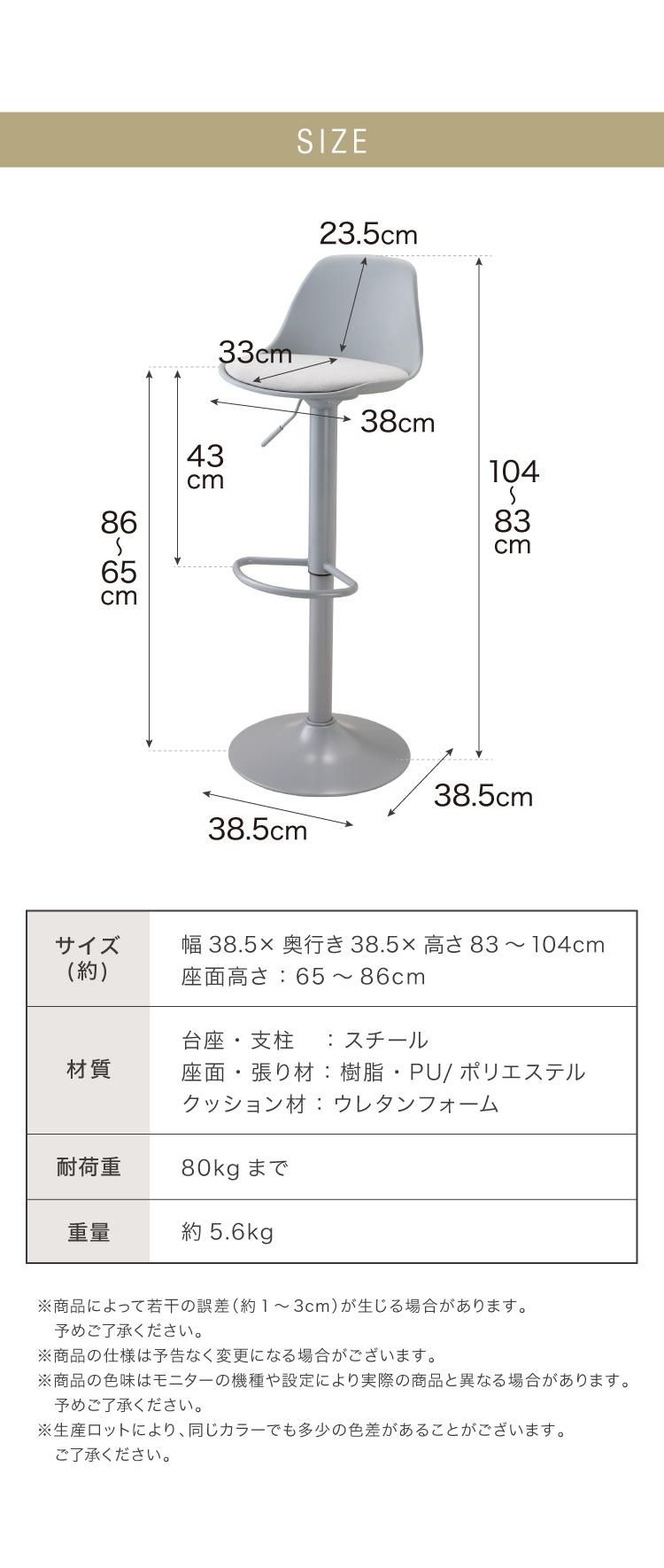 本体:幅38.5×奥行き38.5×高さ83〜104cm
