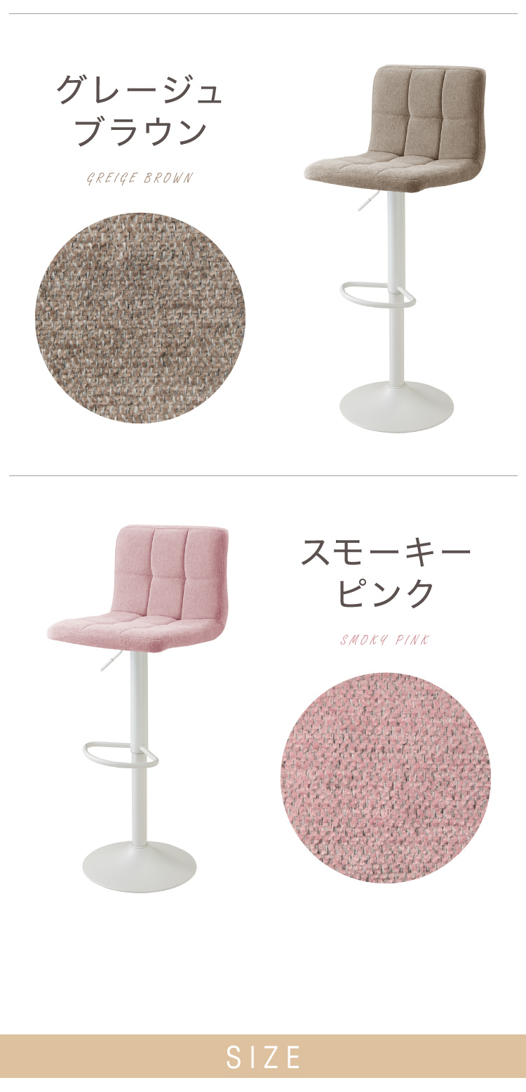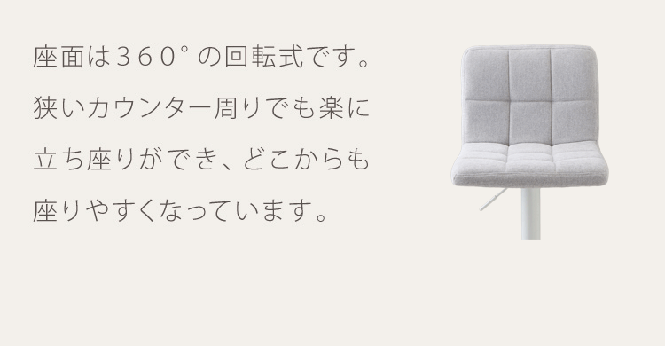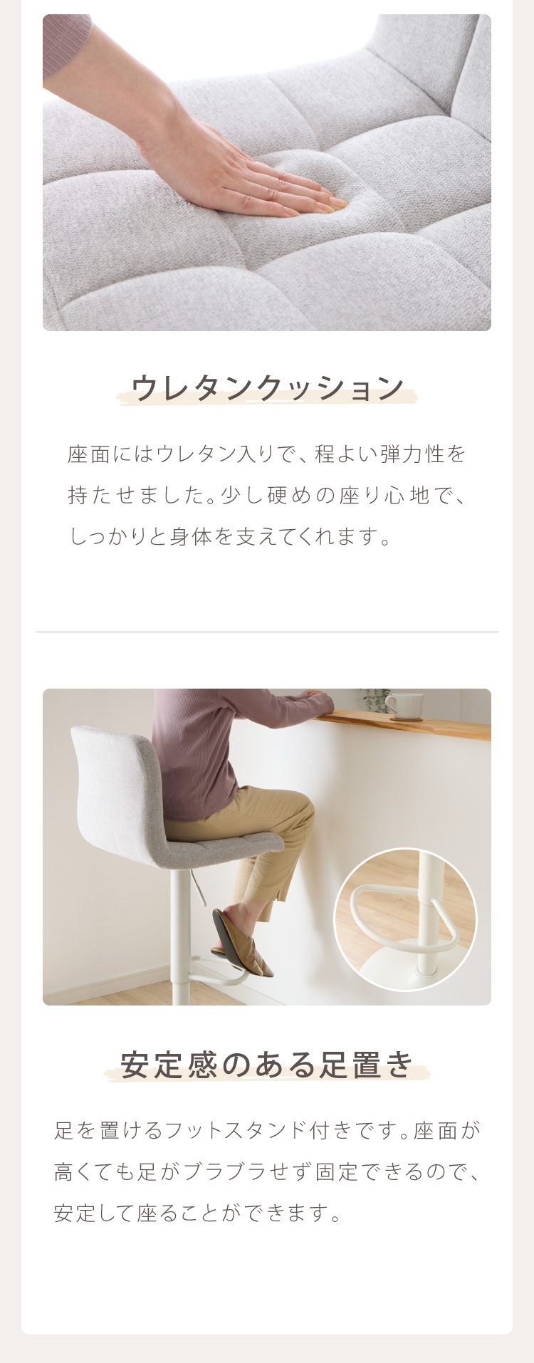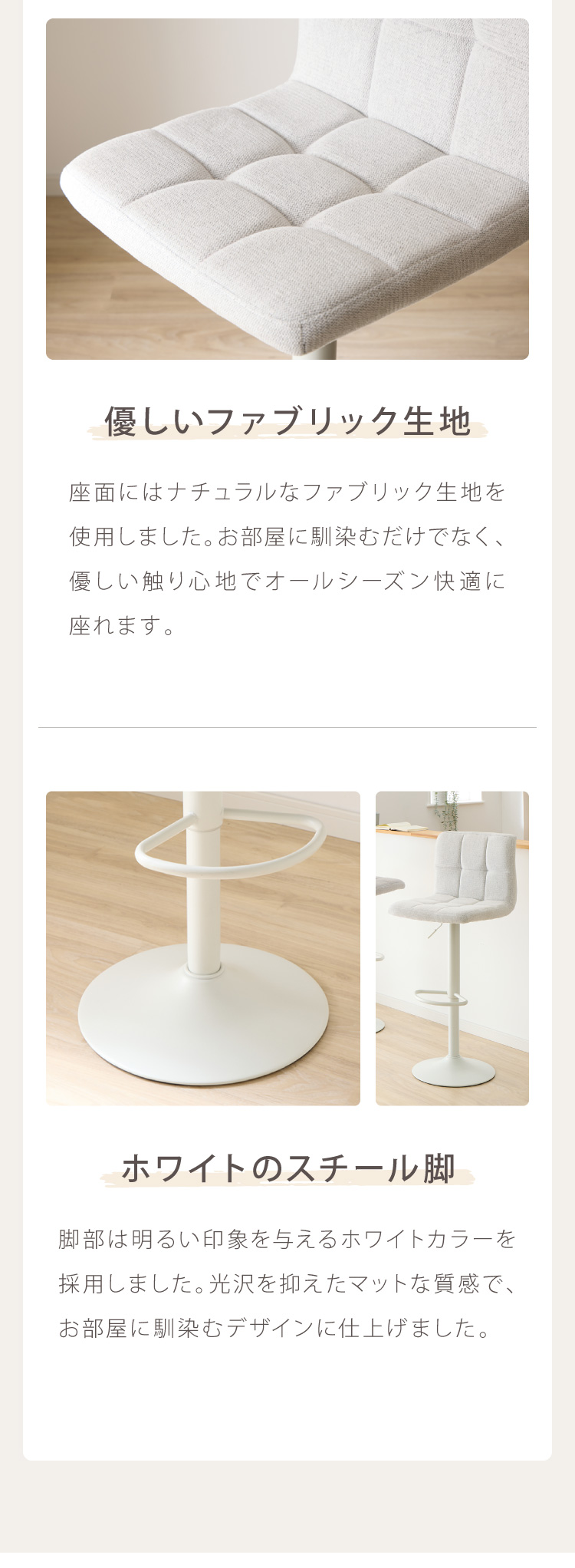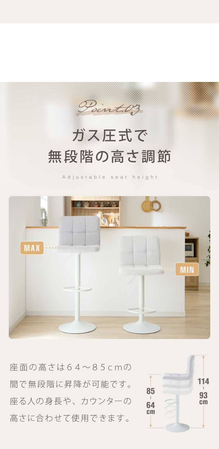 カウンターチェア、ガス圧、回転式、昇降式、ガス圧昇降、背もたれ付き、ファブリック、ナチュラル、モダン、スチール、かわいい、北欧、おしゃれ、韓国風、韓国インテリア