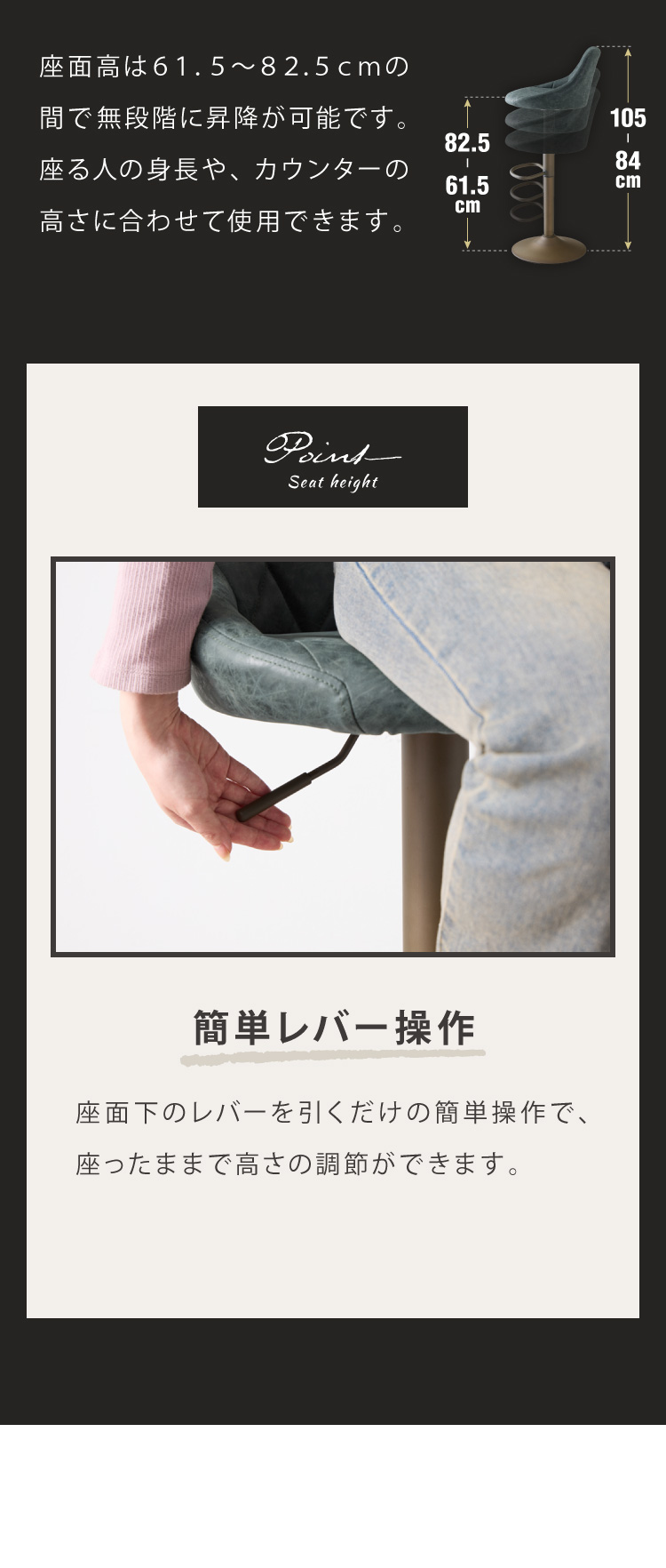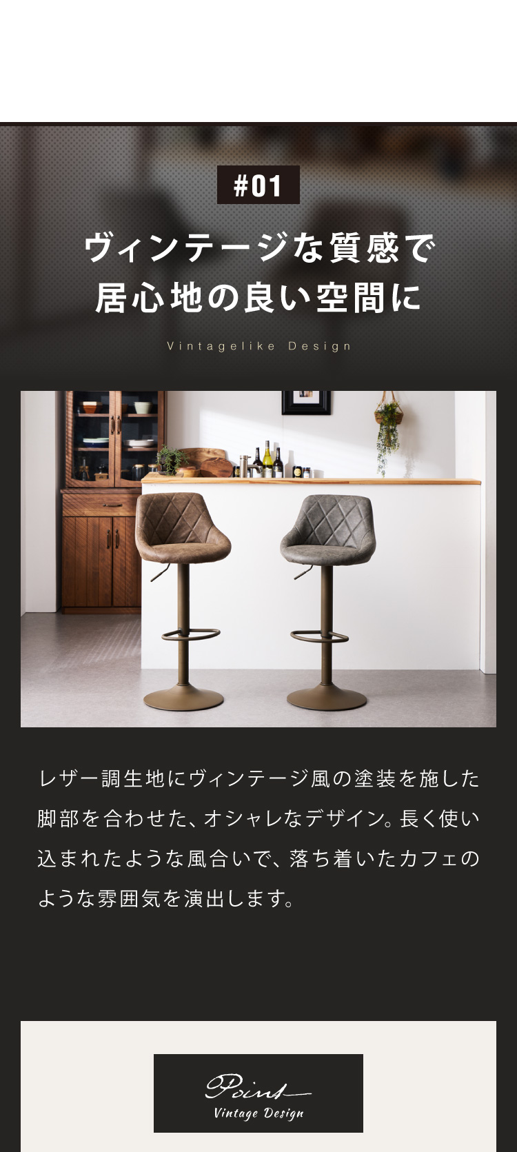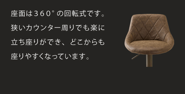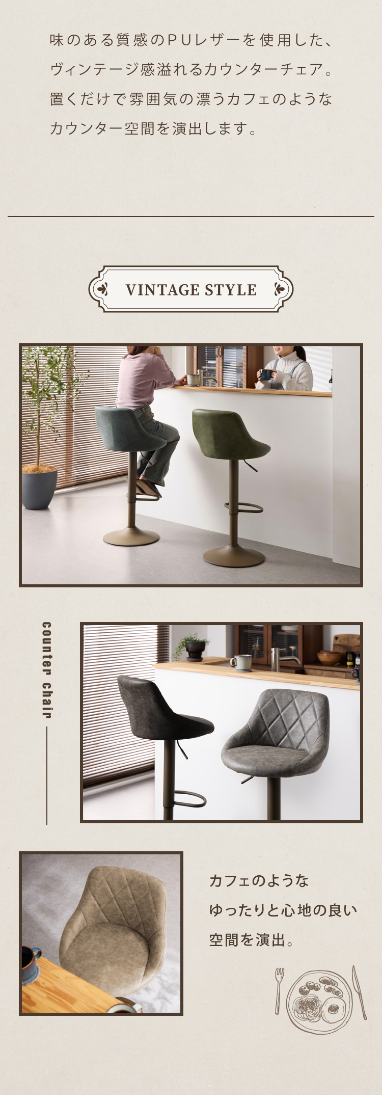カウンターチェア、ガス圧、回転式、昇降式、ガス圧昇降、背もたれ付き、レザー、ヴィンテージ、PUレザー