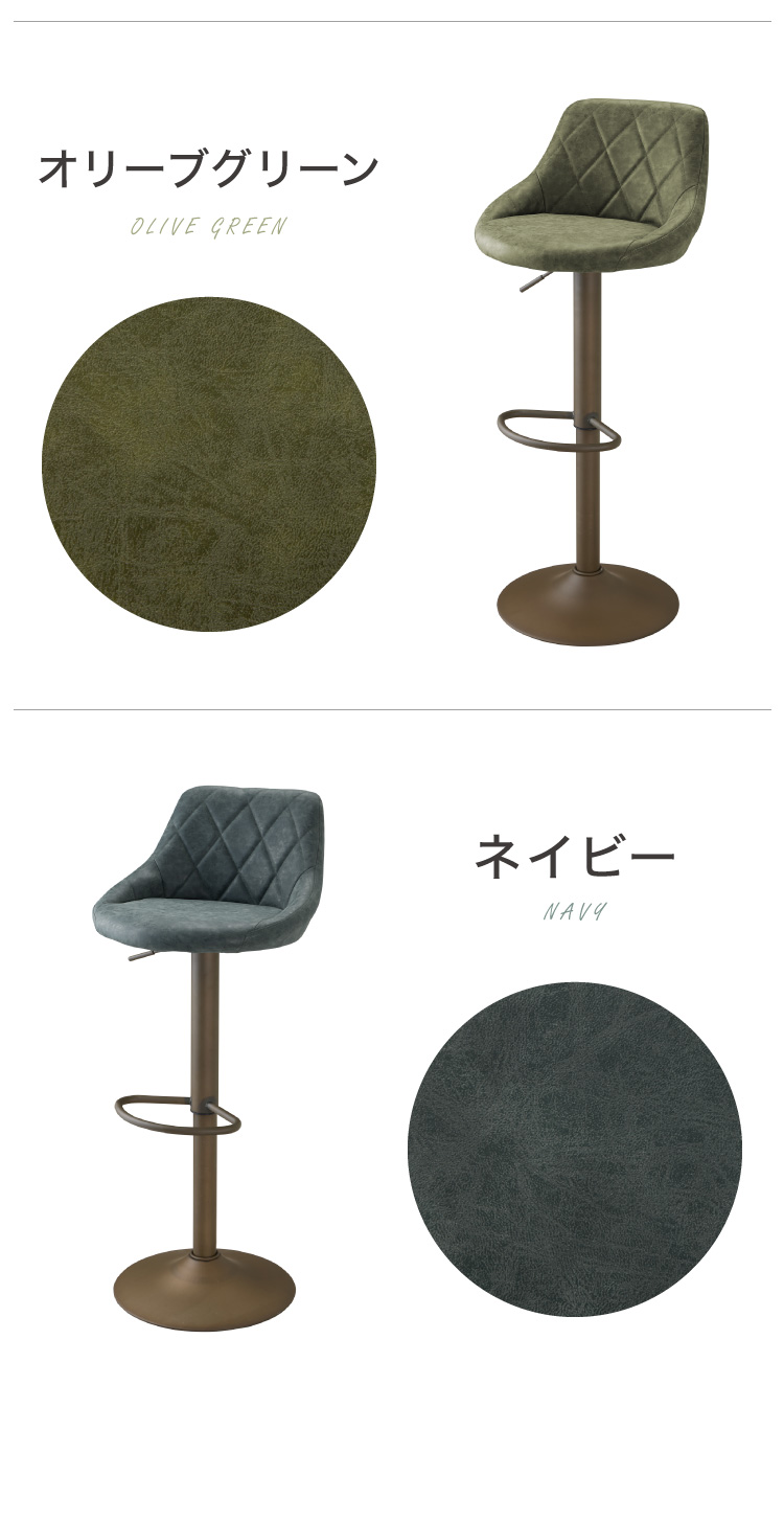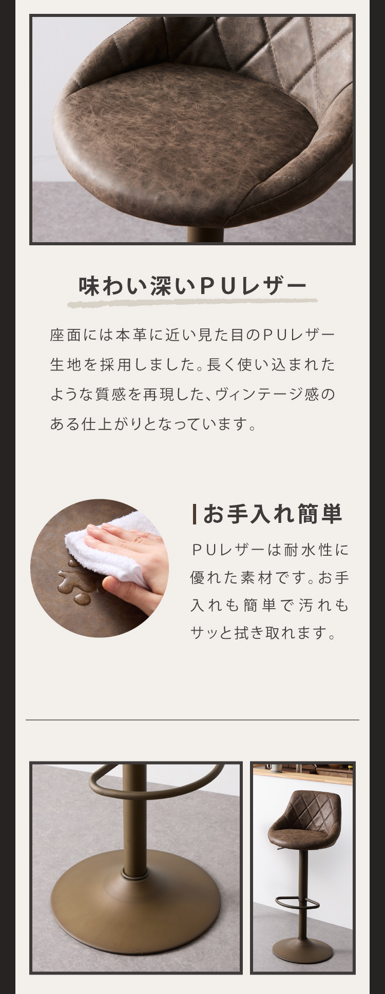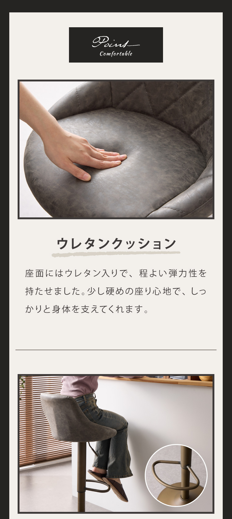 カウンターチェア、ガス圧、回転式、昇降式、ガス圧昇降、背もたれ付き、レザー、ヴィンテージ、PUレザー