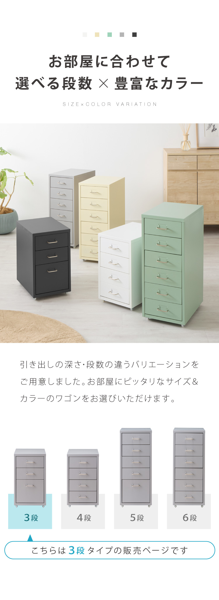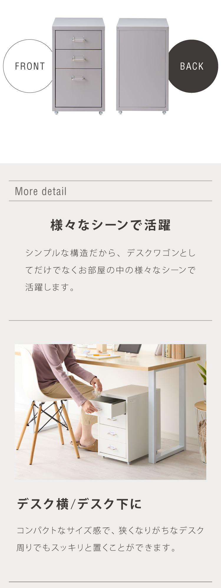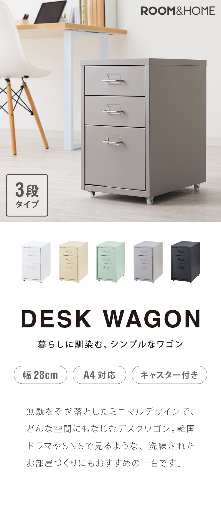 Roomnhome デスクワゴン 3段 キャビネット キャスター付き オフィスワゴン 書類ケース サイドワゴンキャビネット 縦型ファイルキャビネット