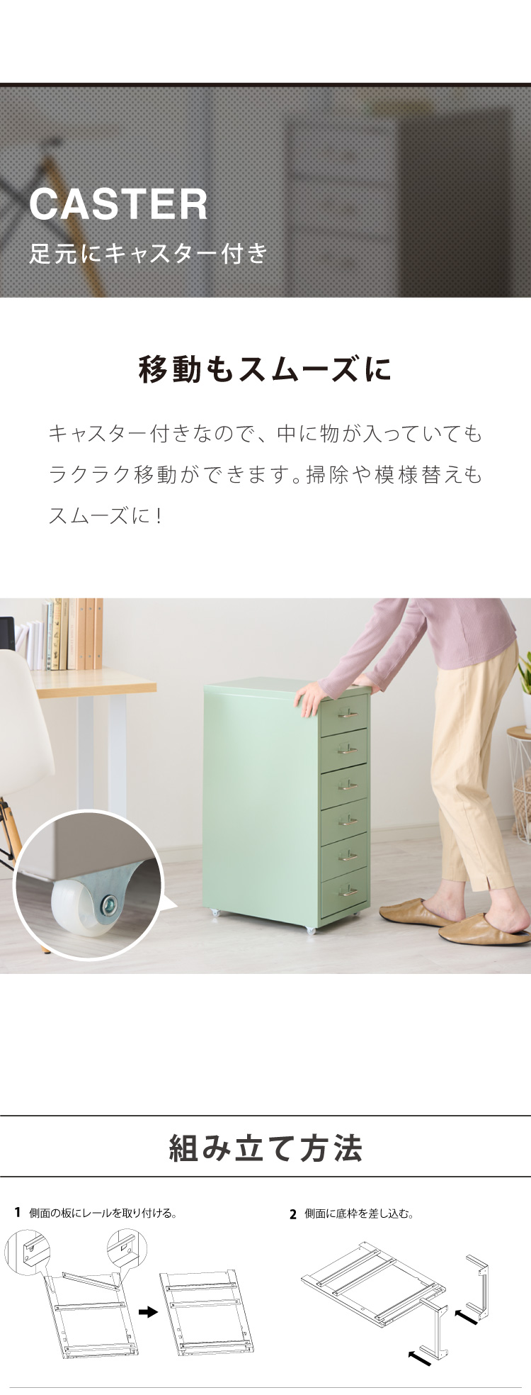 ・キャスター付きで、必要な場所へラクラク移動。掃除や模様替えもスムーズ。