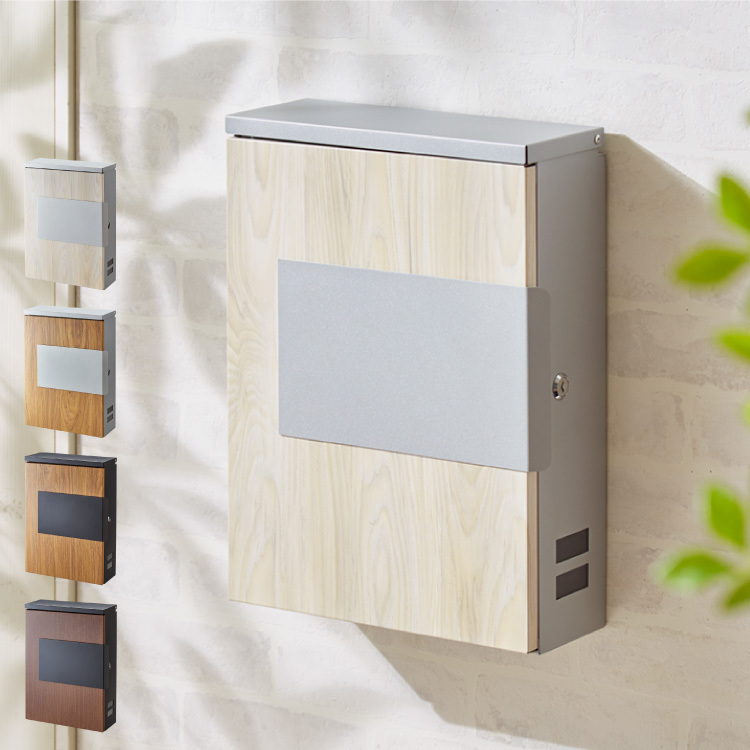 郵便ポスト、キーロック付、スチール製、角2対応、A4対応、大容量、省スペース、コンパクト、軽量、サビにくい、おしゃれ、木目調、鍵付き、セキュリティ、壁付けポスト、郵便受け、郵便、ポスト、メールボックス、POST、ナチュラル×シルバーグレー、ブラウン×ブラック、キャメル×ブラック、キャメル×シルバーグレー