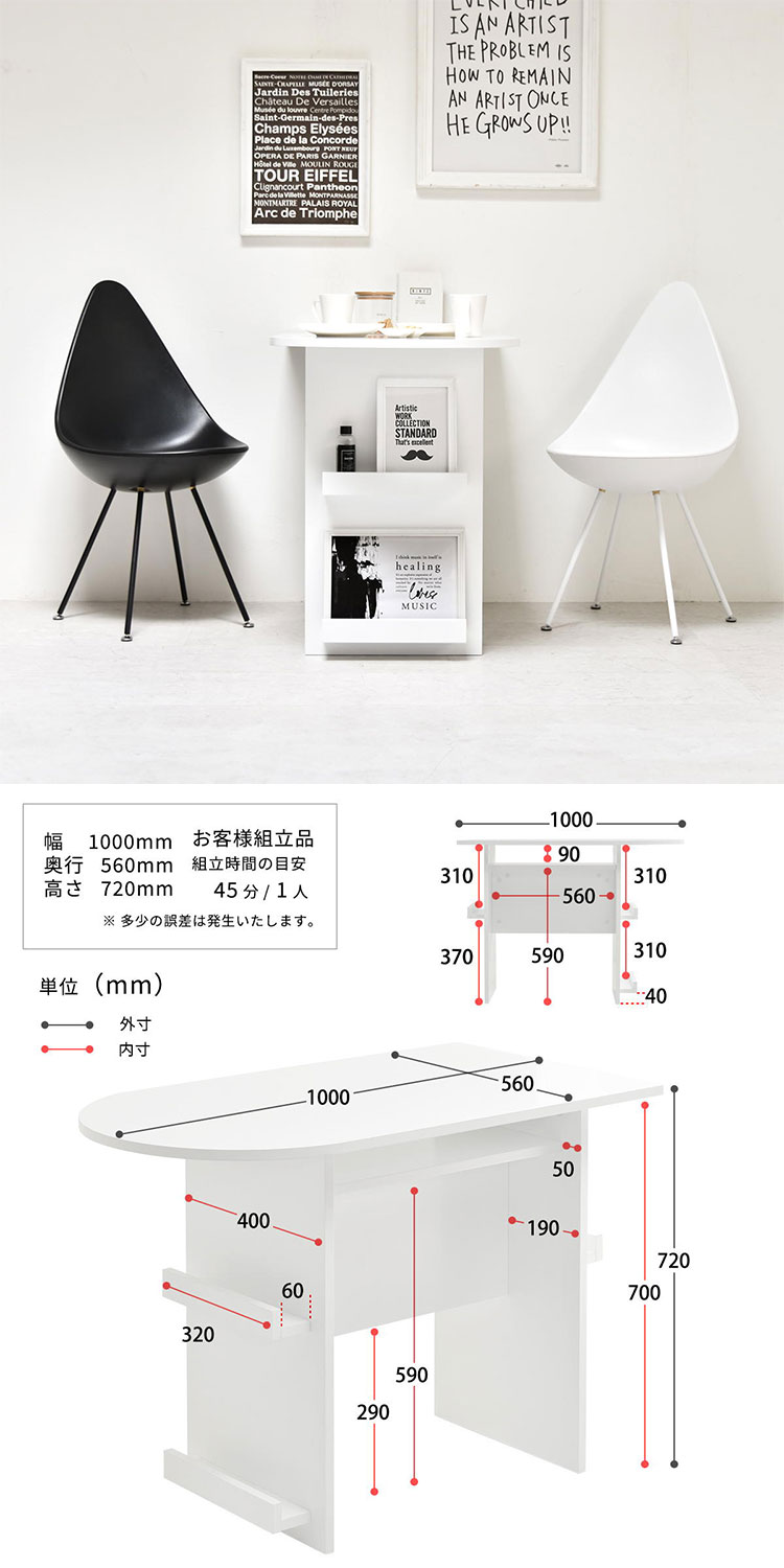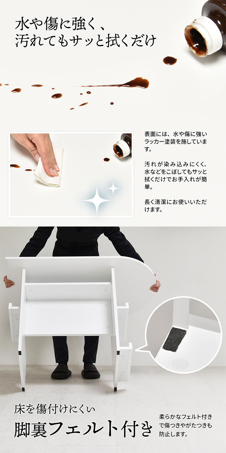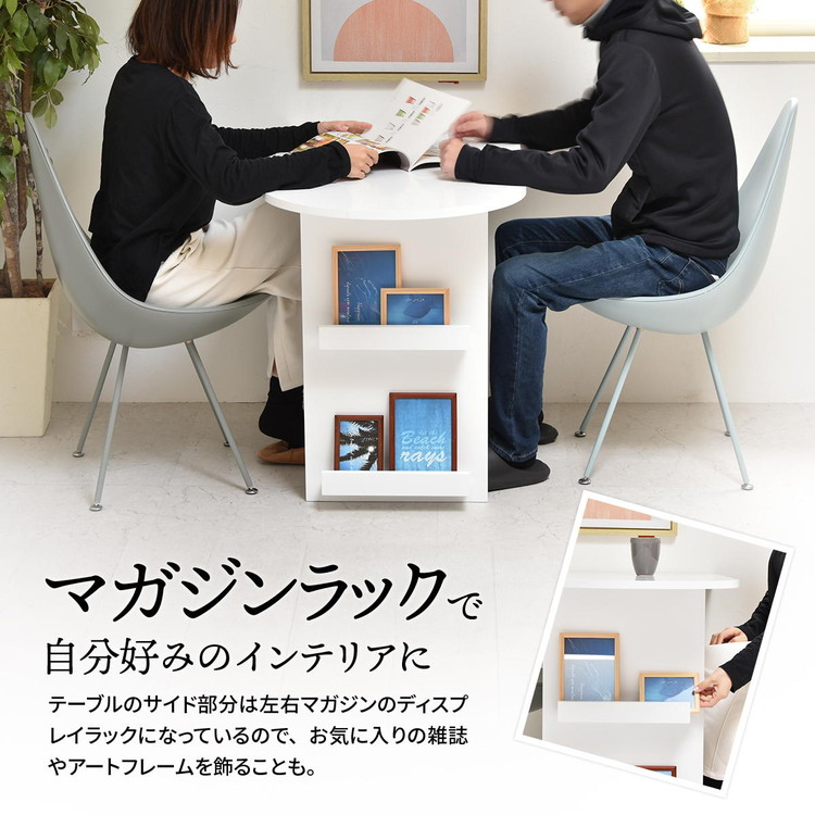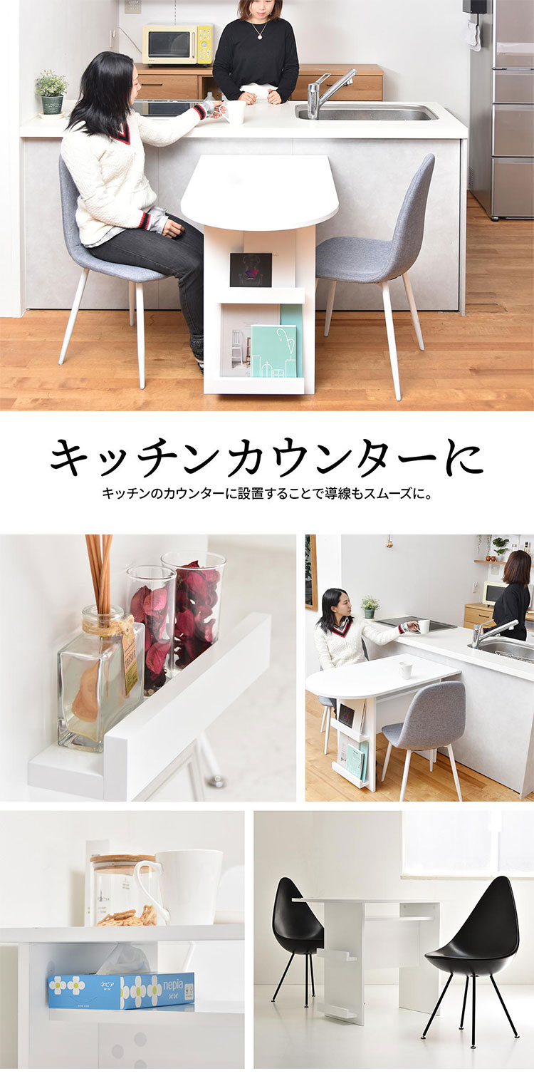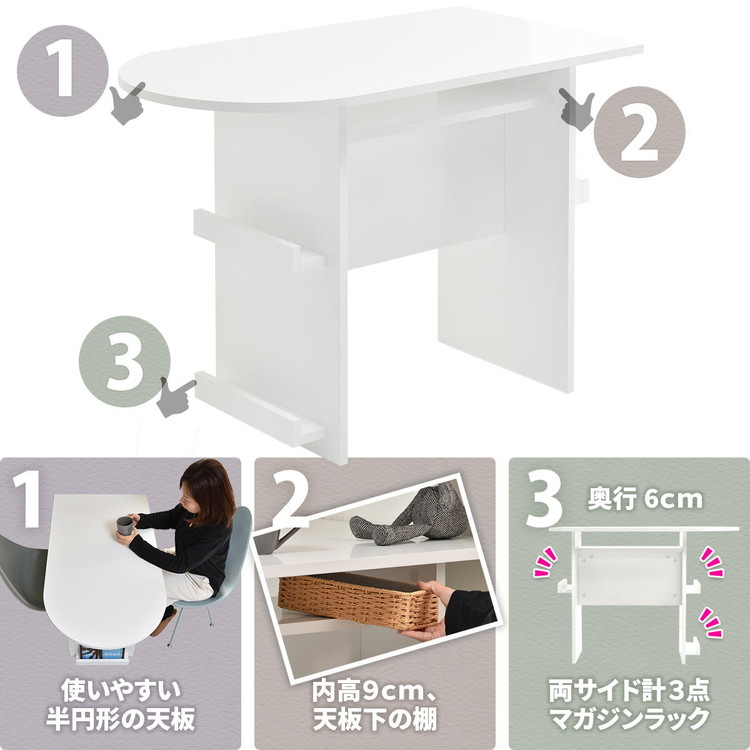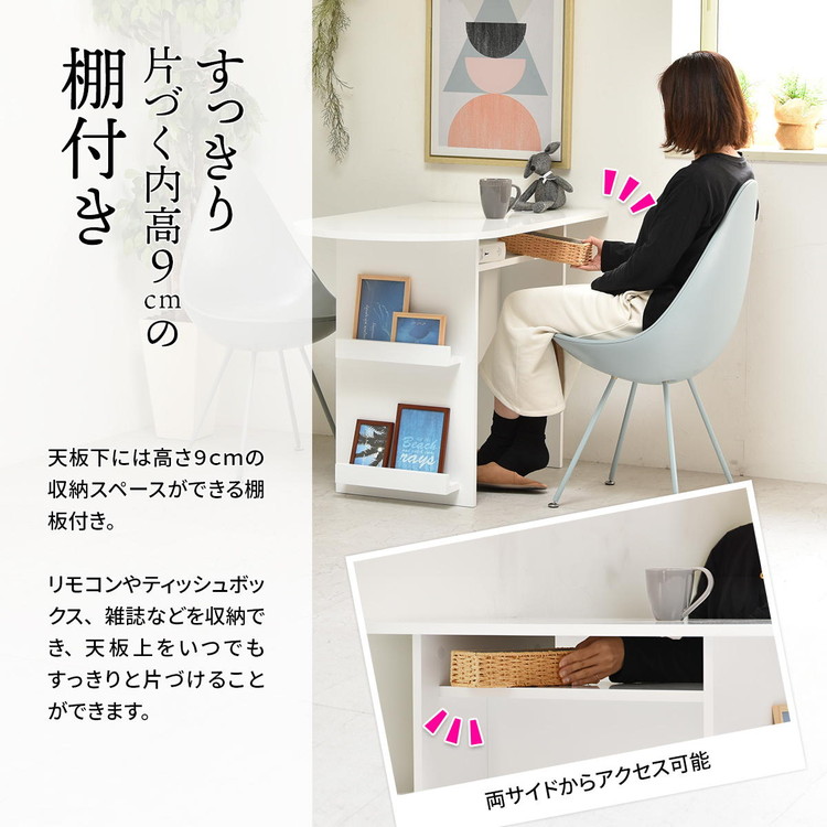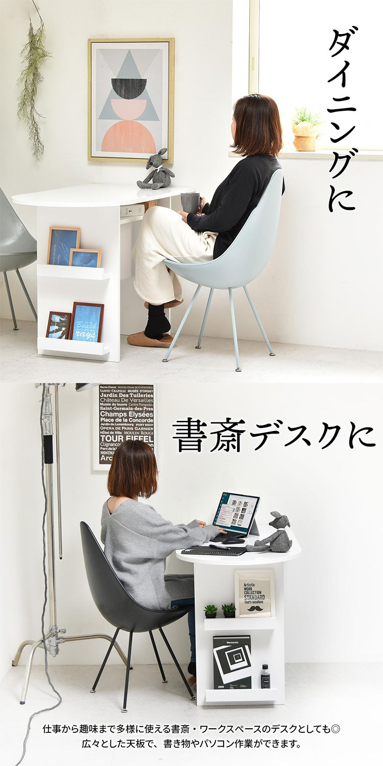 ■真っ白の天板で、しっかりとした造りとコンパクトなデザインの半円ダイニングテーブル。丸みを帯びたデザインがお部屋をスッキリと見立ててくれます。棚板も付いていますので、デスクとしてご使用いただけます。また左右の側板には、雑誌やケーブルタップを収納できる棚が付いていますので、見える棚には雑誌、見えない奥の棚にはタップコードなど収納できます。窓辺に向けて置いたり、キッチンカウンターと合わせて置くと、ちょっとしたカフェスペースに変身!