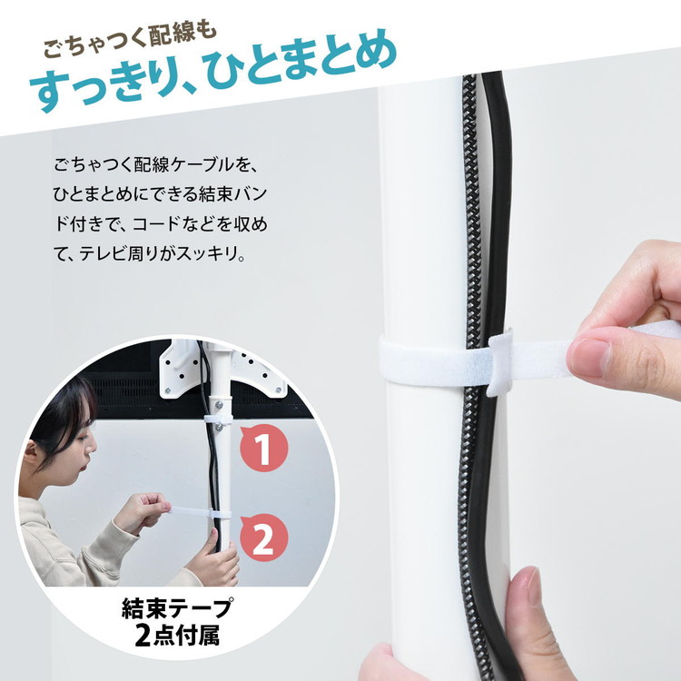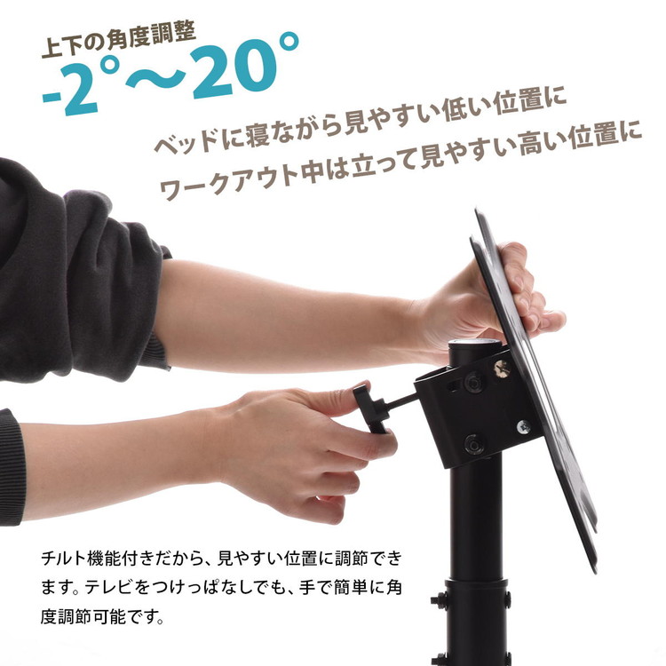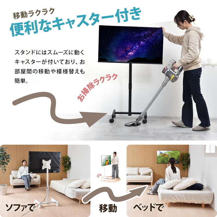 ■13〜42型までのテレビに対応した、本体耐荷重20kgのスタンドです。高さが3段階に調節できるうえに、キャスターもついていて簡単に移動可能。キャスターがあれば簡単に移動ができ、オフィスや学校、寝室などでサッとテレビスタンドを移動させられるのはもちろん、テレビスタンド近辺を掃除したいときにも役立ちます。