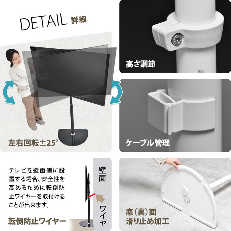 ■32〜65型までのテレビに対応した、本体耐荷重40kgの壁寄せタイプのテレビスタンド。首振り機能がついているので左右25度で角度が変えれますので、お好みの角度でテレビをご覧いただけます。土台はオシャレな半円の8mm強化ガラスなので、接地面の段差が低くなっており、足が引っ掛かりにくいなっています。スタイリッシュでモダンなデザインなので、設置するだけでお部屋の雰囲気をおしゃれに変えられます。