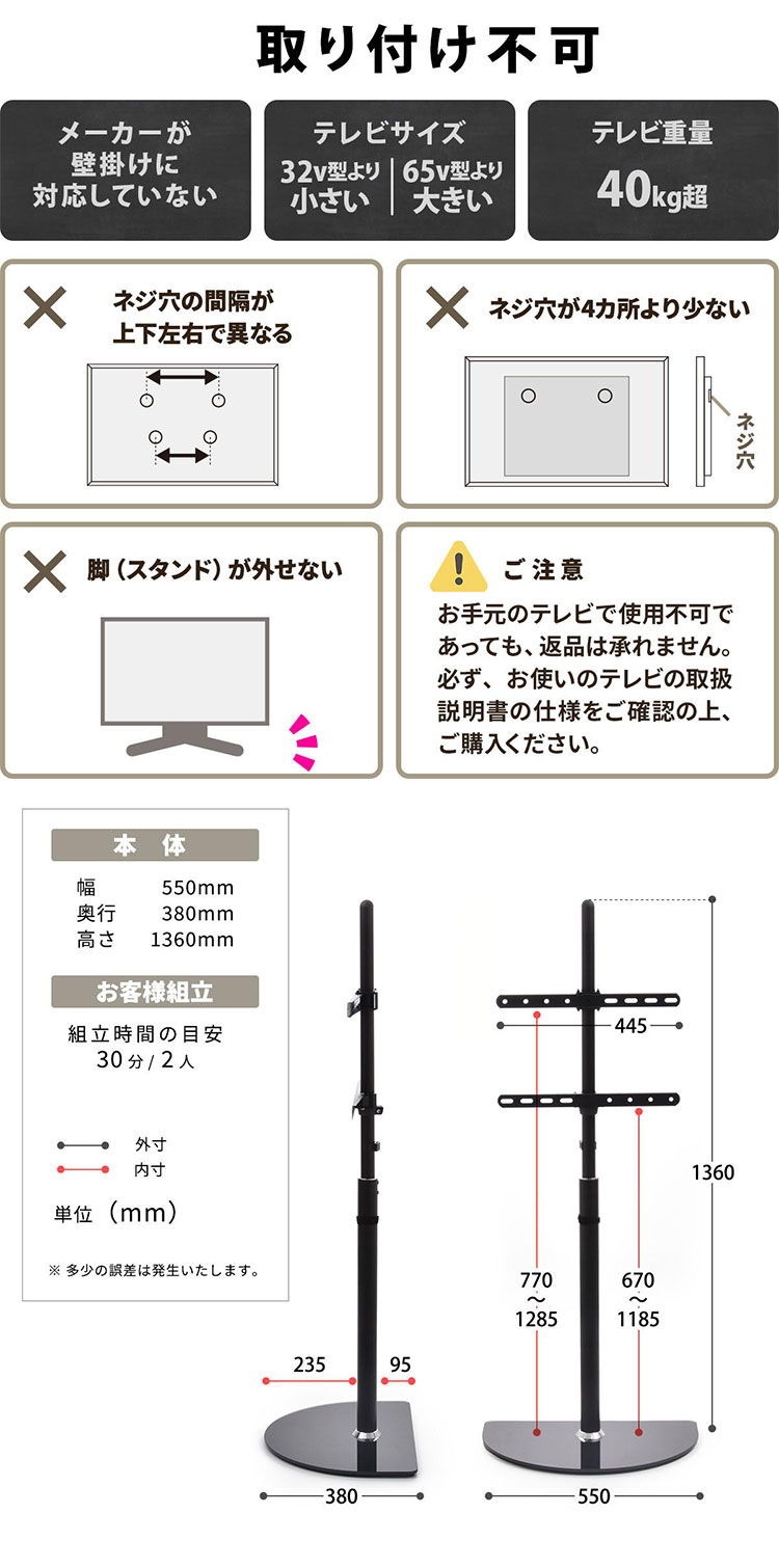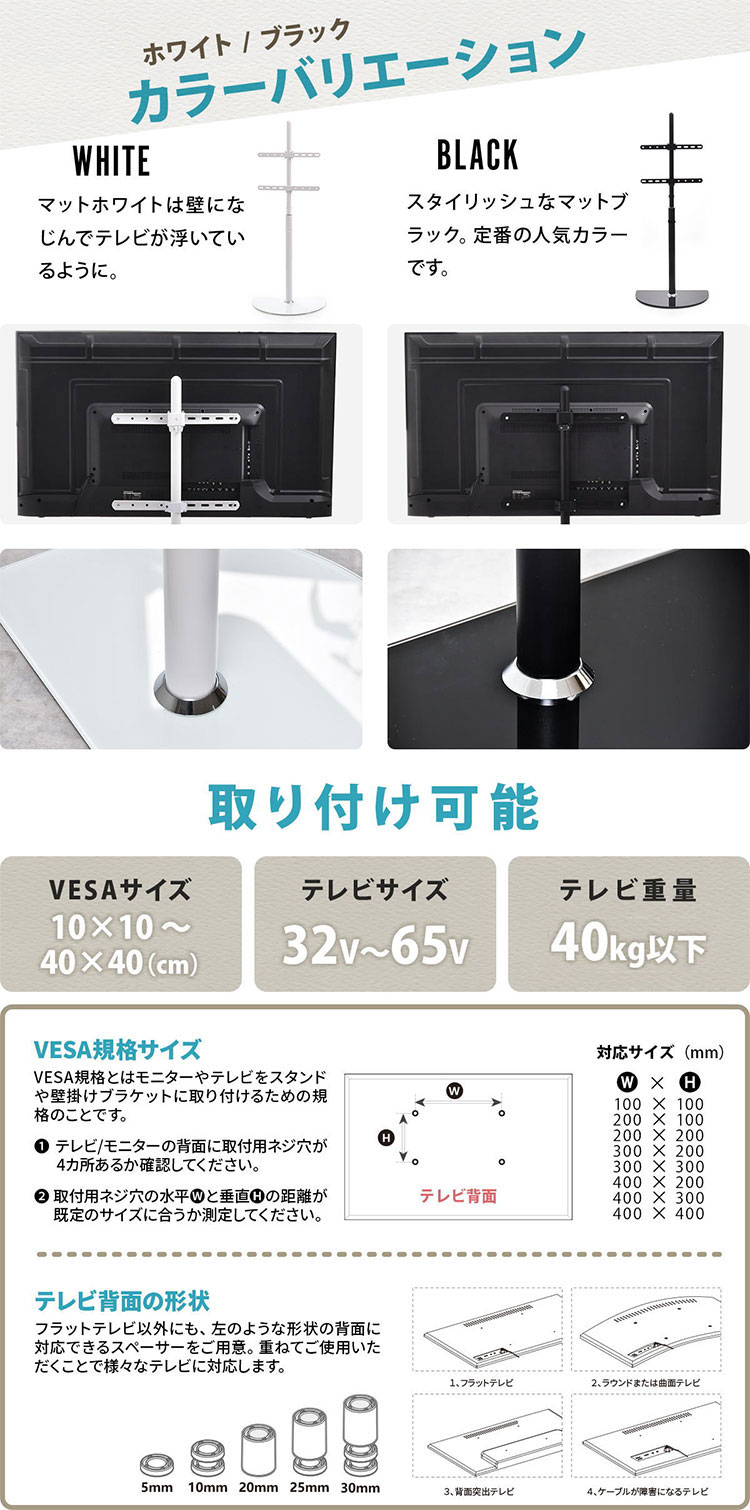 ■素材:【支柱】スチール(粉体塗装) 【底板】8mm強化ガラス 【対応テレビ】32-65型 【対応VESA】100×100mm〜400×400mm