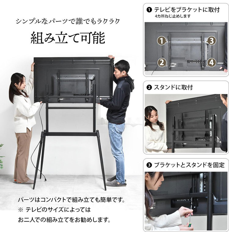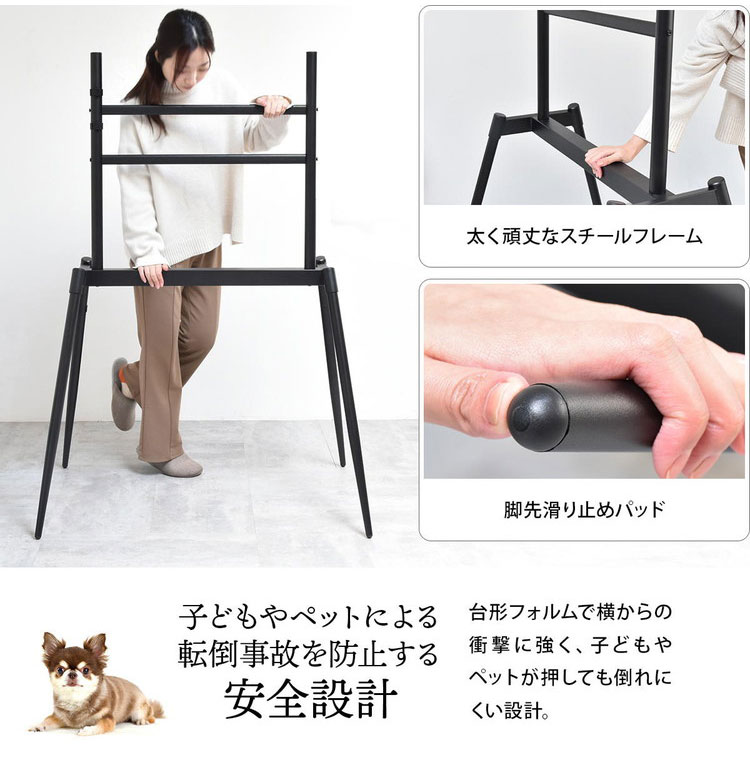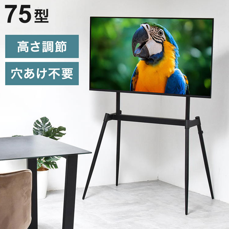 ■32〜75型までのテレビに対応した、本体耐荷重60kgのイーゼルタイプのテレビスタンド。テレビとイーゼルスタンドを一体化させることで、テレビをインテリアのように演出してくれます。お部屋を引き締める上品なブラックで、シンプルなデザイン。すっきりと開放感のあるフォルムが、スタイリッシュな空間を演出いたします。また、高さ調整が可能で、リビングやダイニング、寝室など様々なシーンに合わせてお使いいただけます。テレビをアートのように飾り、すっきり美しくスマートなお部屋に。