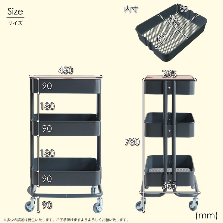 耐荷重:天板:約10kg/メッシュバスケット:約15kg(1個)=全体約55kg