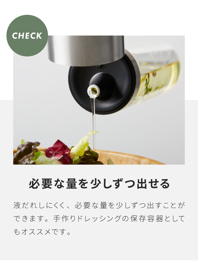 オイルやビネガーの酸化を防ぎ、美味しさを保つ保存ボトル。