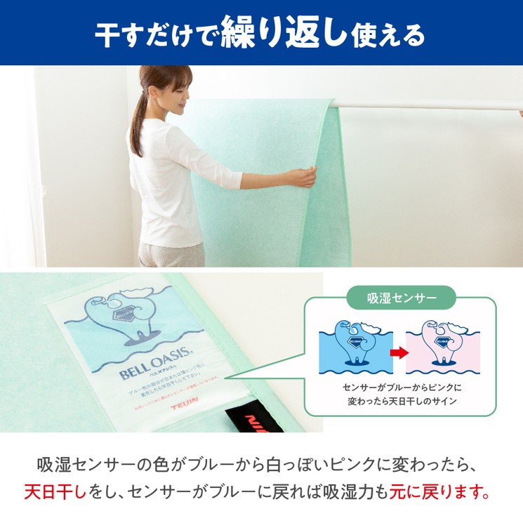 特長:シリカゲルの約2〜3倍、木綿の約7倍の吸湿性能を誇るテイジンの高性能繊維ベルオアシス(R)を使用した除湿シートです。