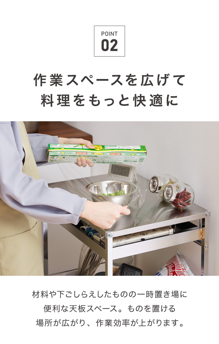 キャスターが付いているためお好きな場所まで移動し、調理スペースとして使えます。
