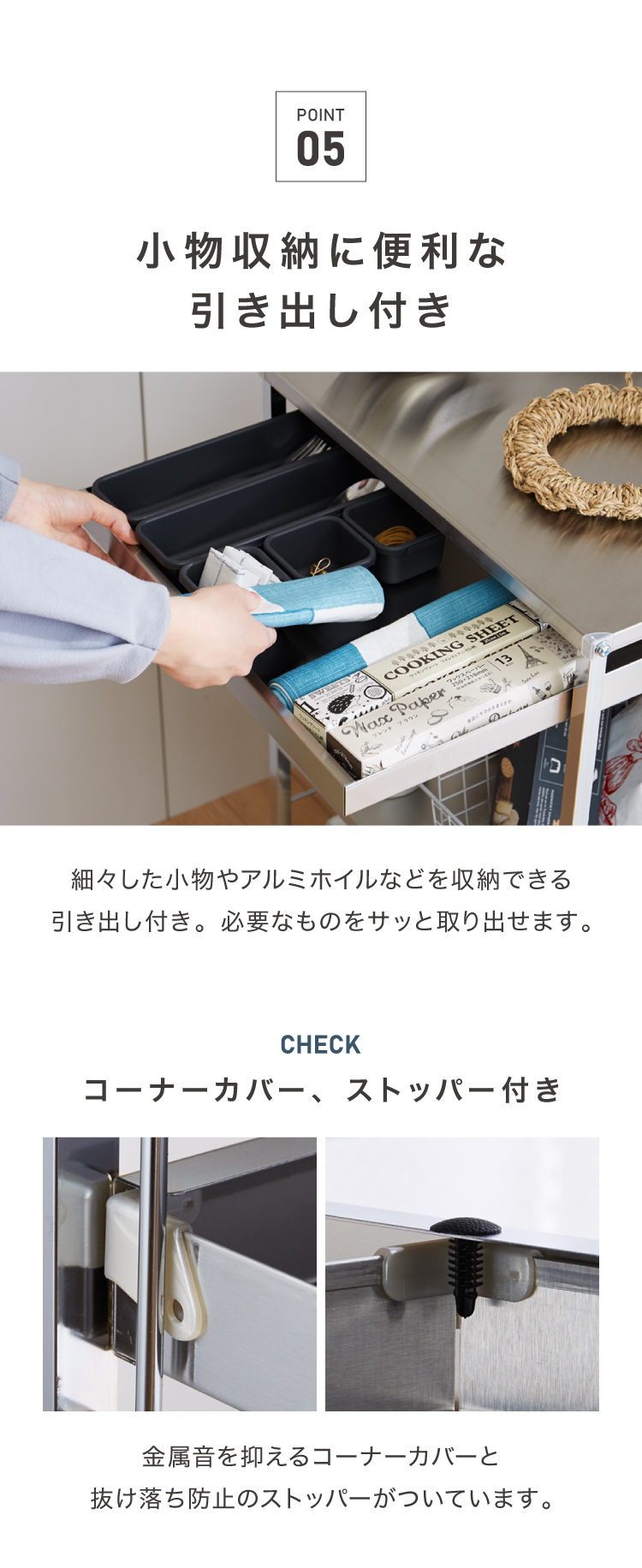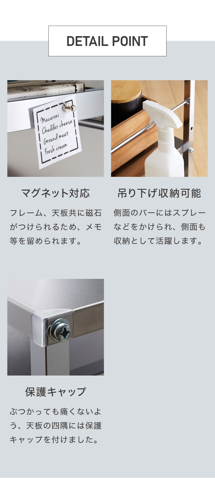 天板の四隅には保護キャップ付き。